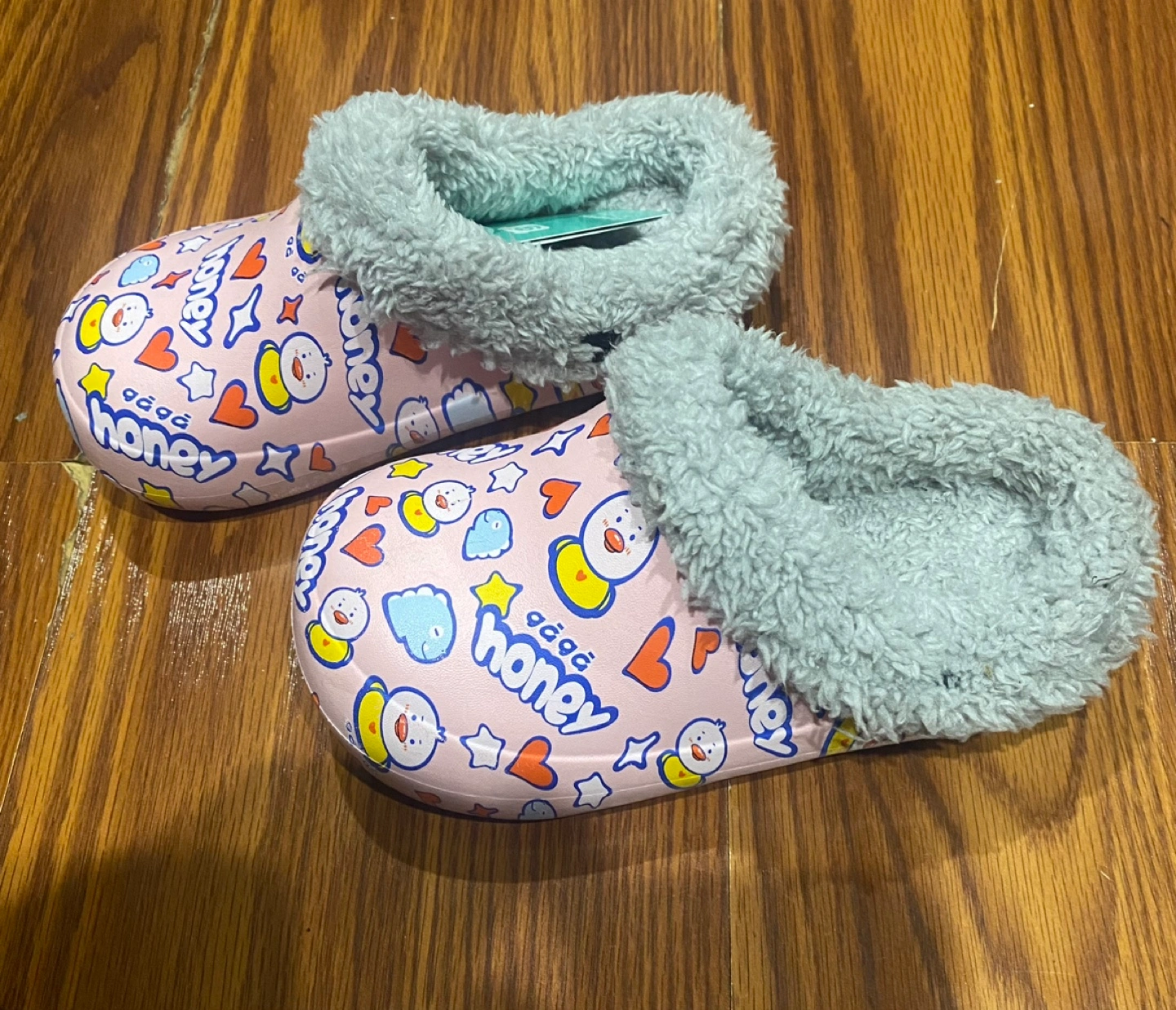 Adorable girls clogs. Size 190mm(1.5) Pink with duck and honey print. Fuzzy gray lining. Perfect for keeping little feet warm.