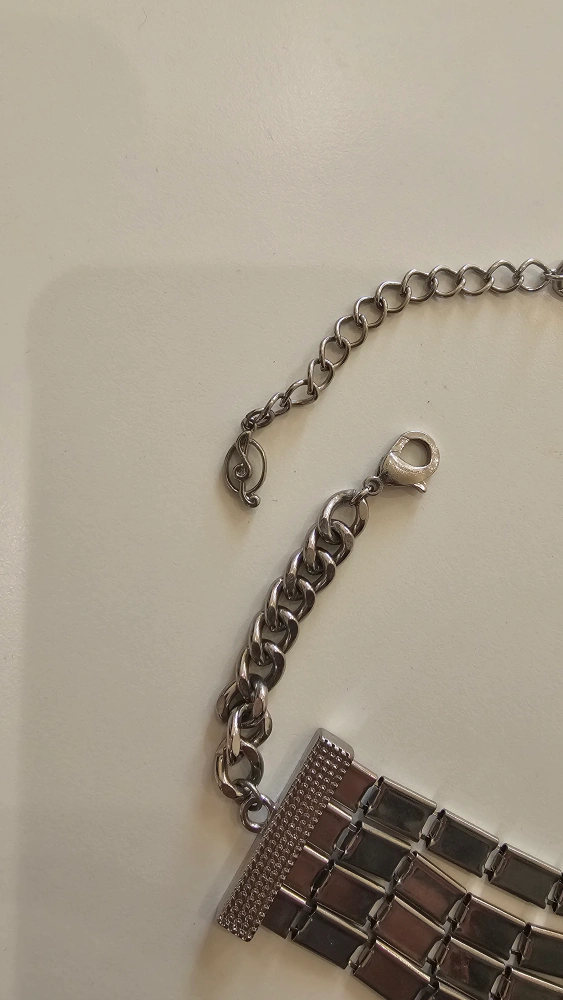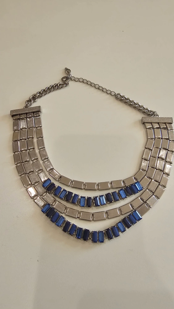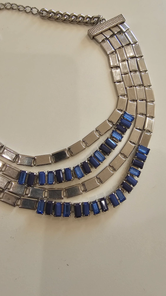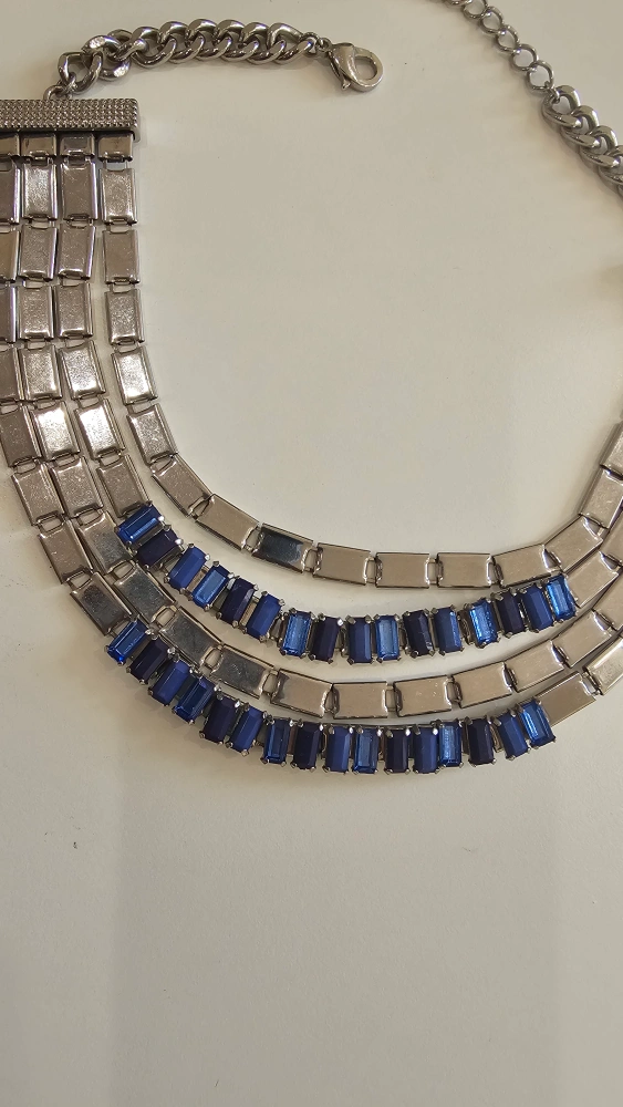 Stunning statement necklace. Features multiple strands of silver-tone metal linked together. Three strands include rows of dark blue rectangular rhinestones. Lobster clasp closure. brand, stradivarius