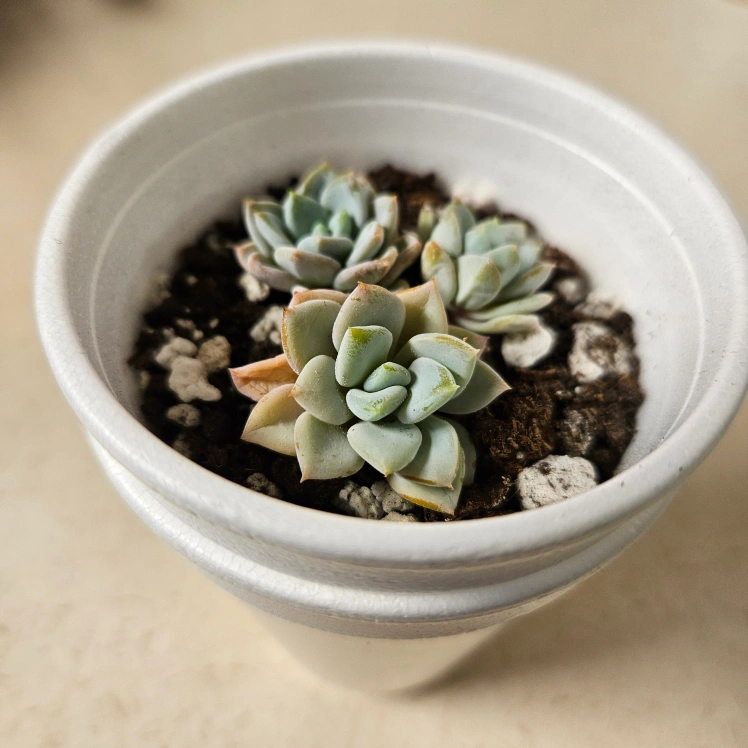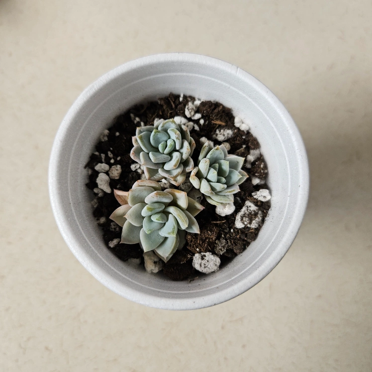 Three small Graptoveria ‘Opalina' offsets planted together.