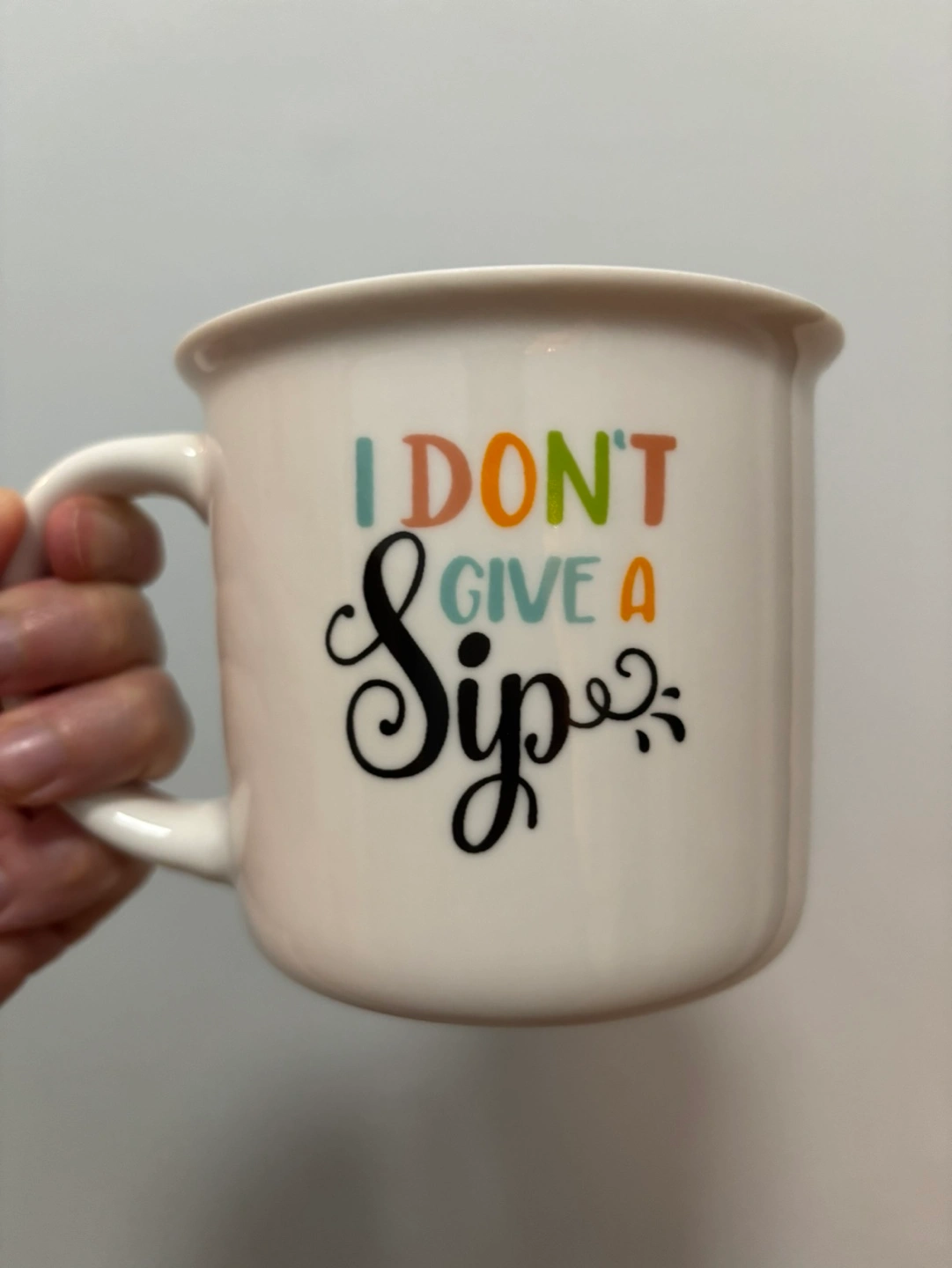 Large white ceramic mug. Features a fun saying: "I don't give a sip". Microwave and dishwasher safe. Nice thin curved edge.