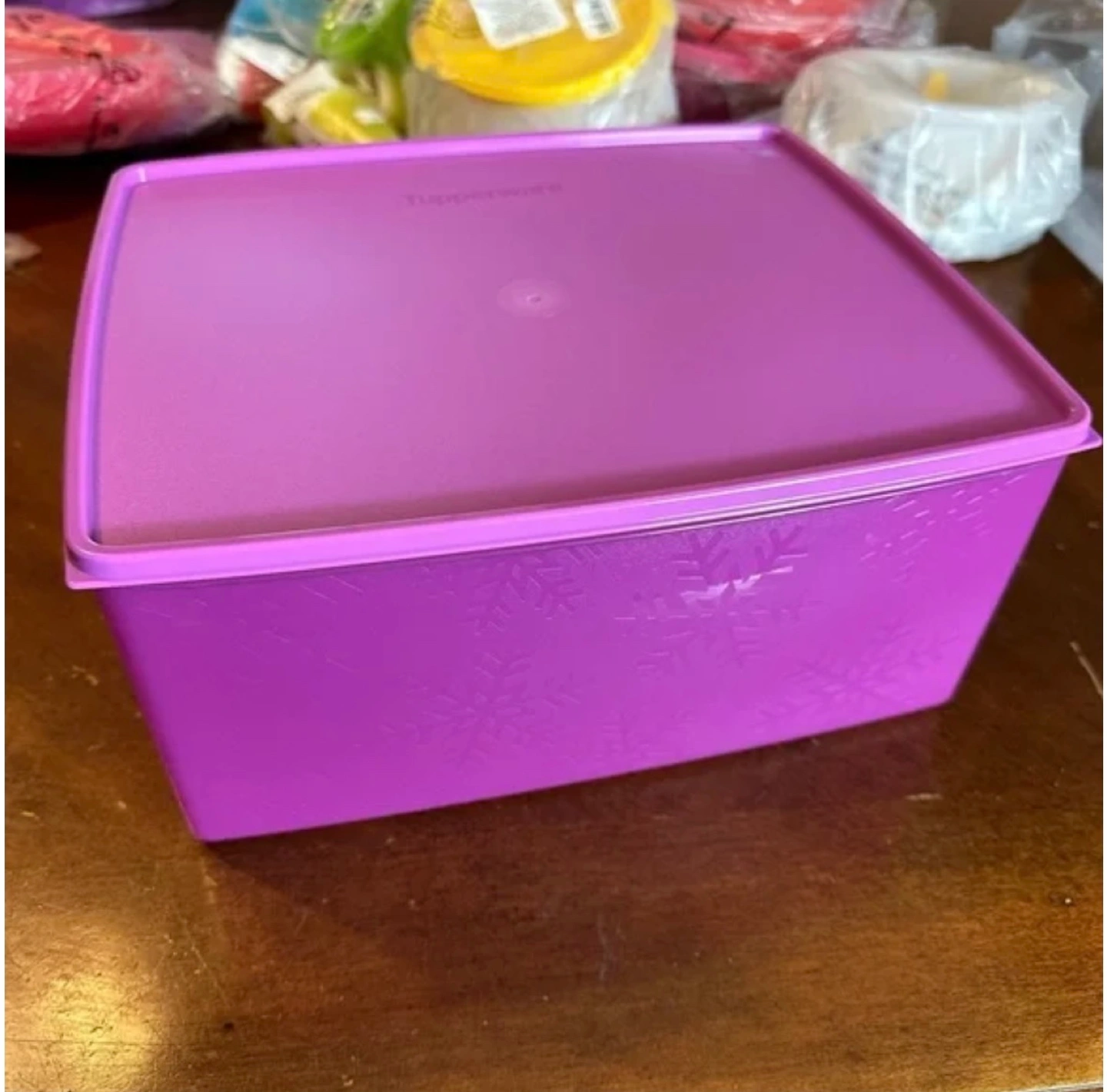 Purple plastic storage container. Snowflake design. Lid included. Great for organizing.