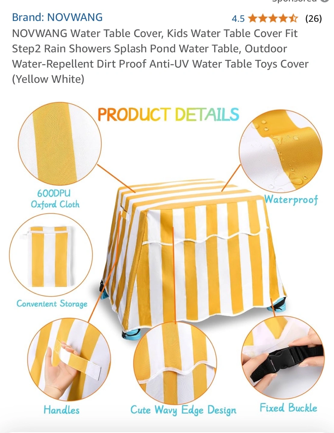Water-resistant cover for kids' water table. Features convenient handles and a storage bag. Anti-UV and dirt proof. Durable 600DPU Oxford cloth. Cute wavy edge design. Buckle closure.brand new