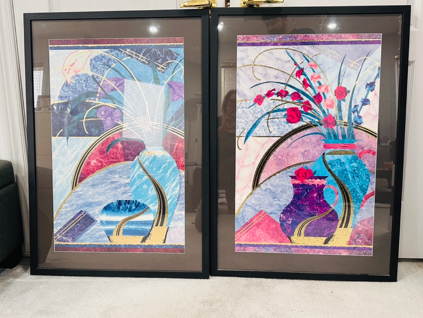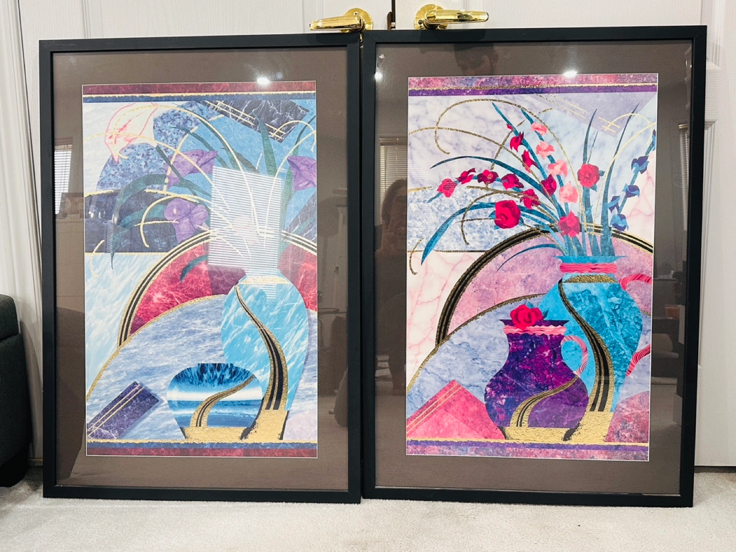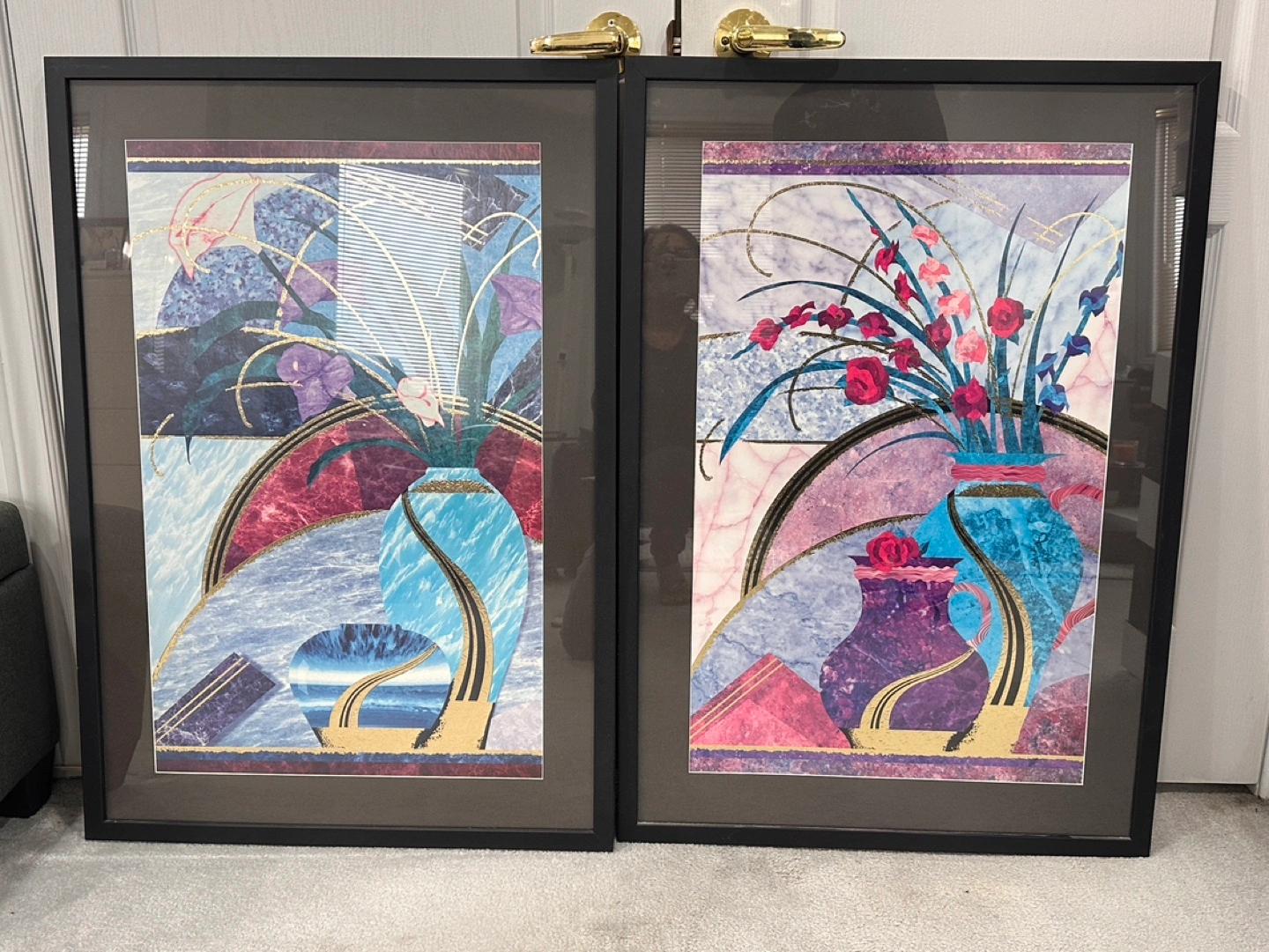 Matching framed prints. Floral designs in teal, purple, and pink. Black frames. Beautiful accent pieces.