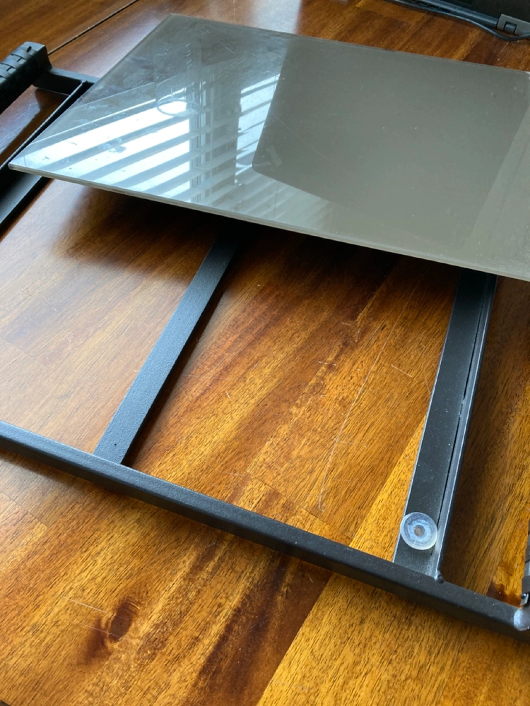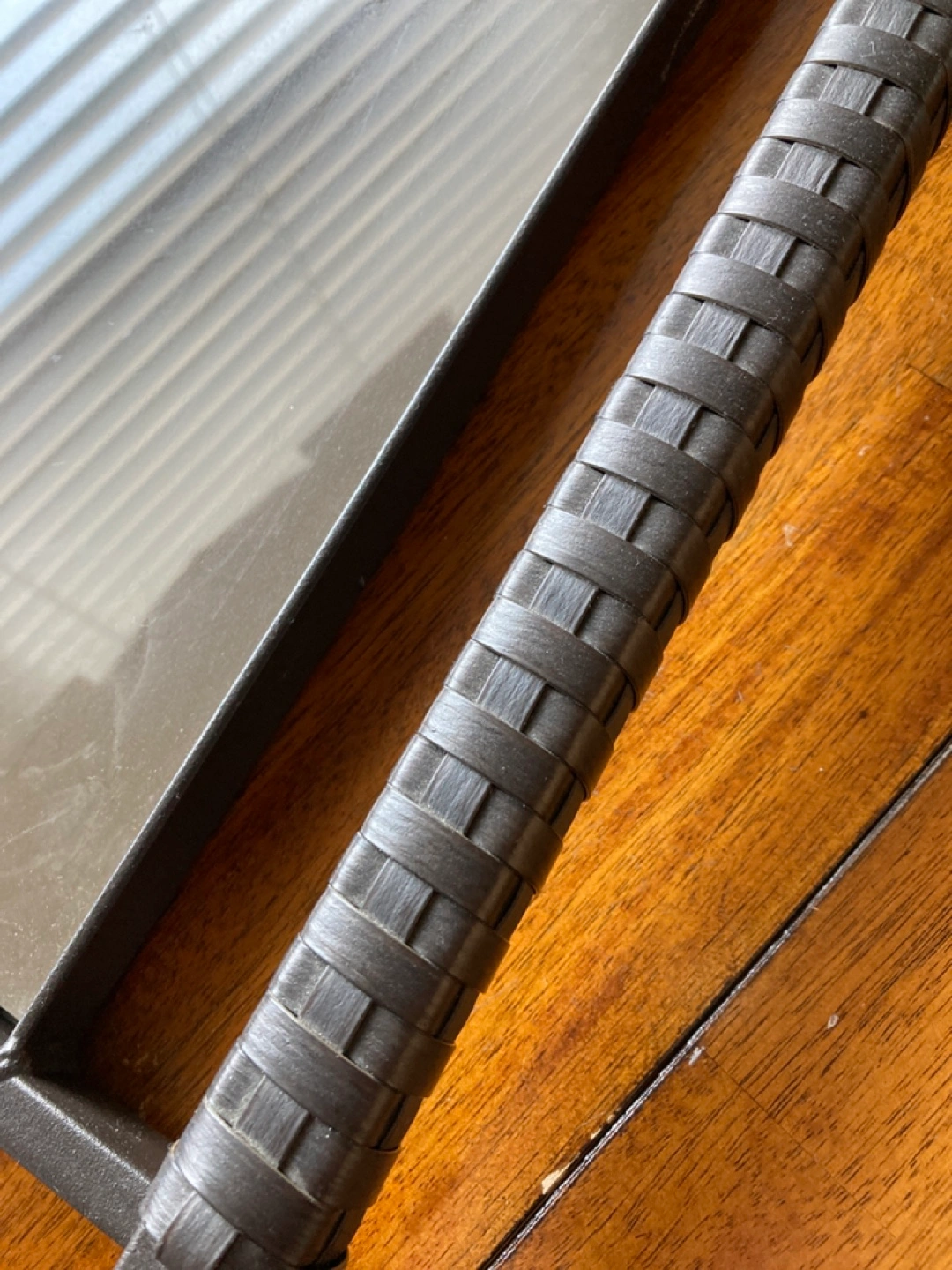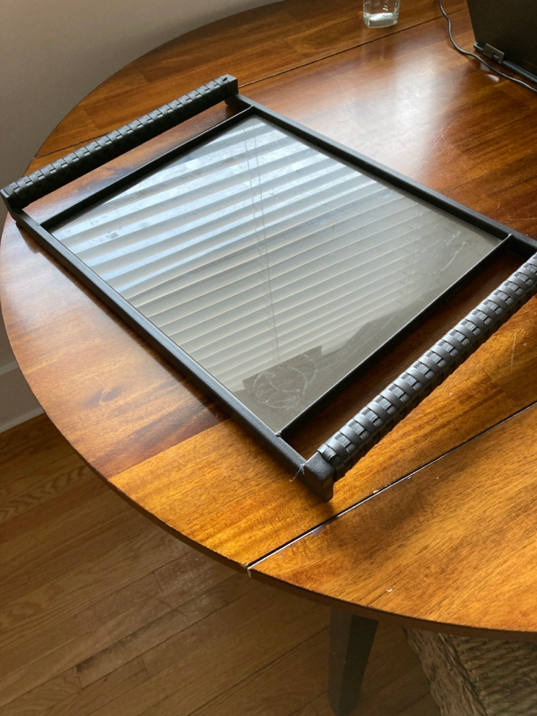 Serving tray. Brown metal frame. Glass top. Woven detail on handles. Excellent for serving or displaying items.