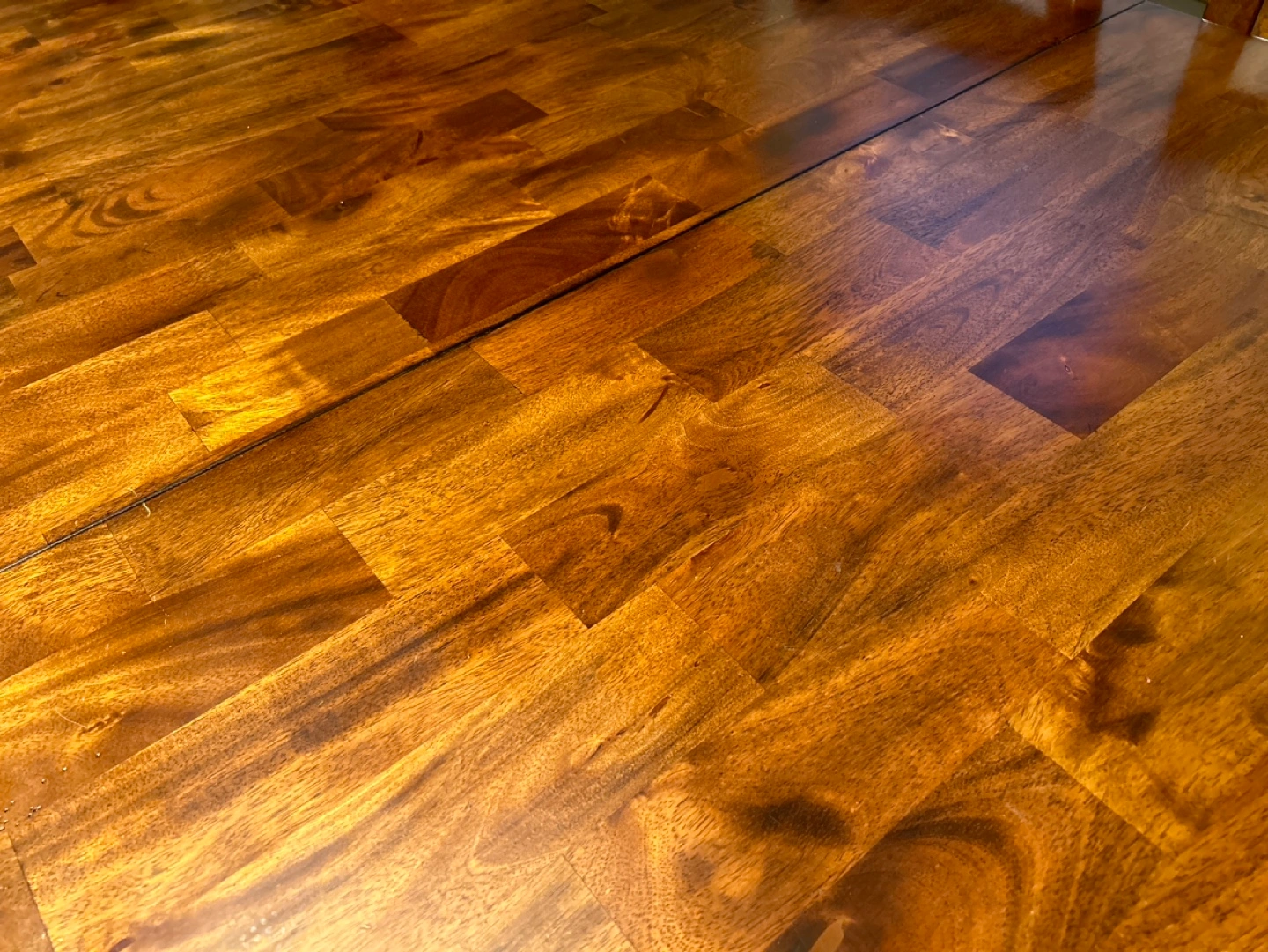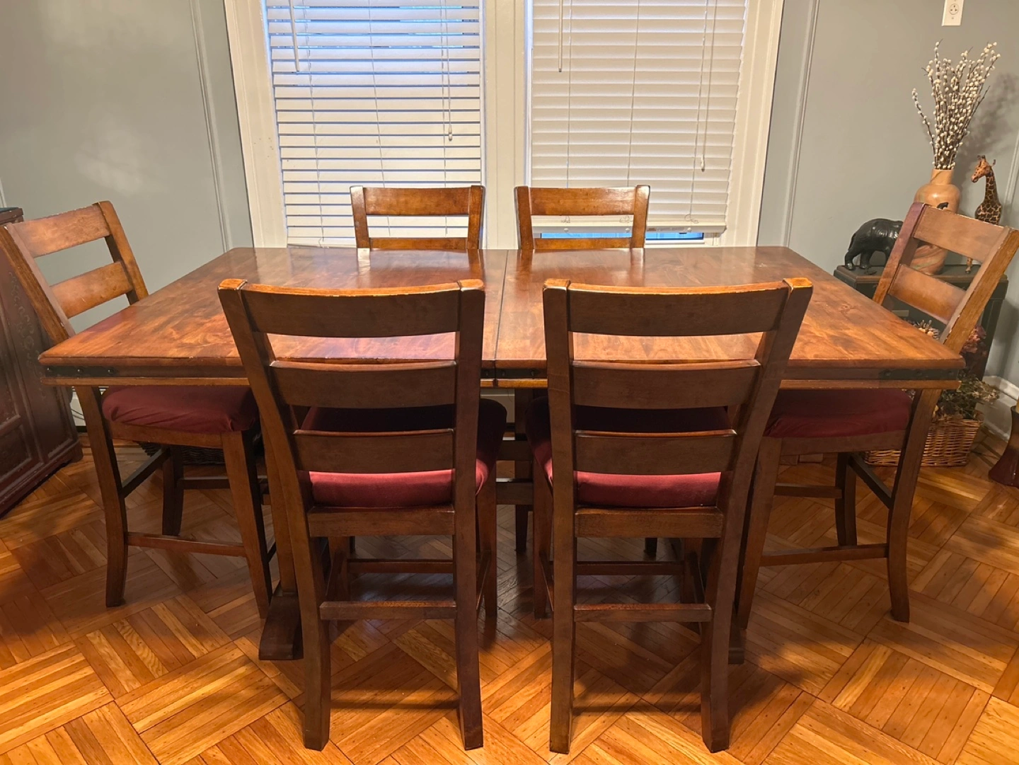 Beautiful dark brown wood dining table. Six matching chairs with burgundy cushions. Table expands to 8ft for extra seating. Great for everyday use or entertaining.