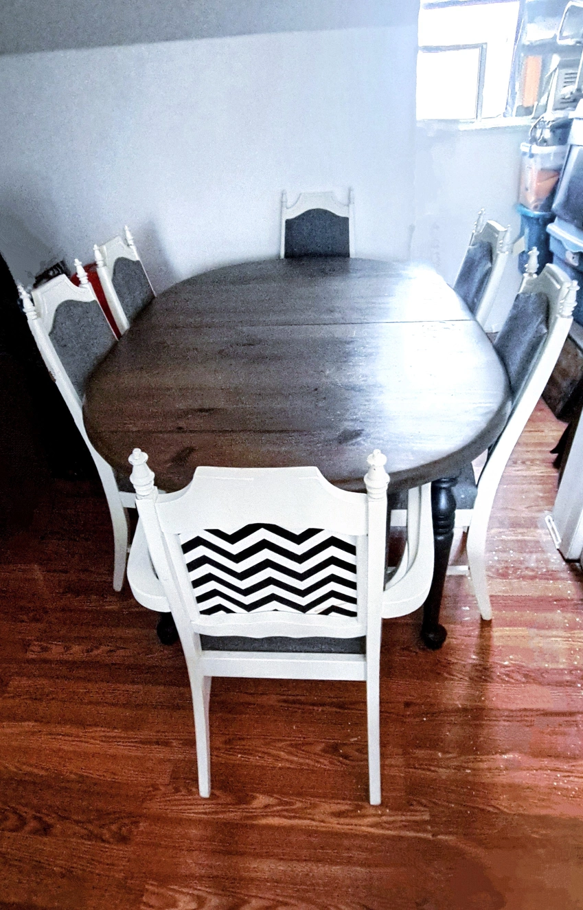 Six chairs and an oval dining table. Chairs feature grey fabric seats and black and white chevron patterned backs. Table has a dark wood finish. Unique vintage style. Also included is a 18inch wooden mid section to expand the table for larger company.