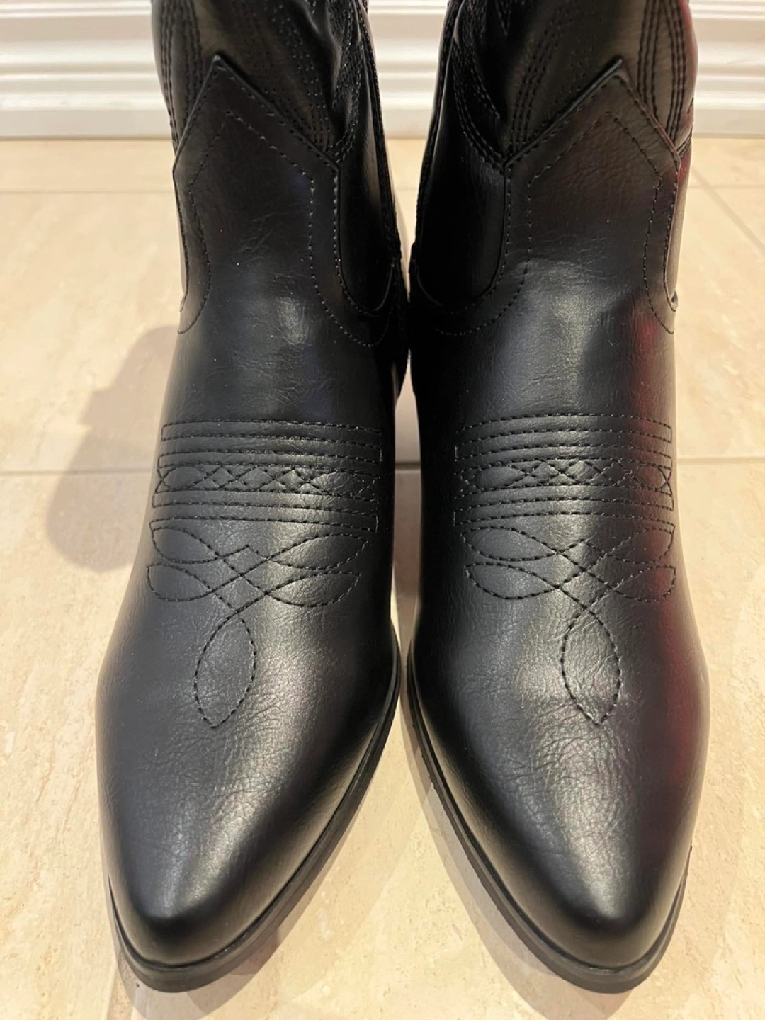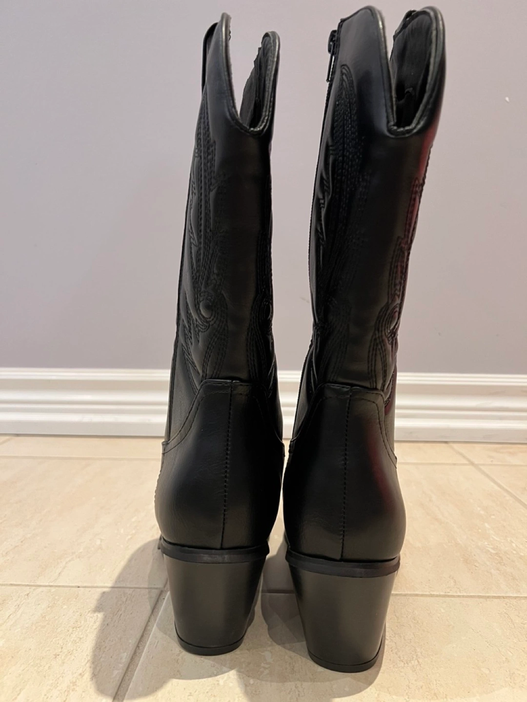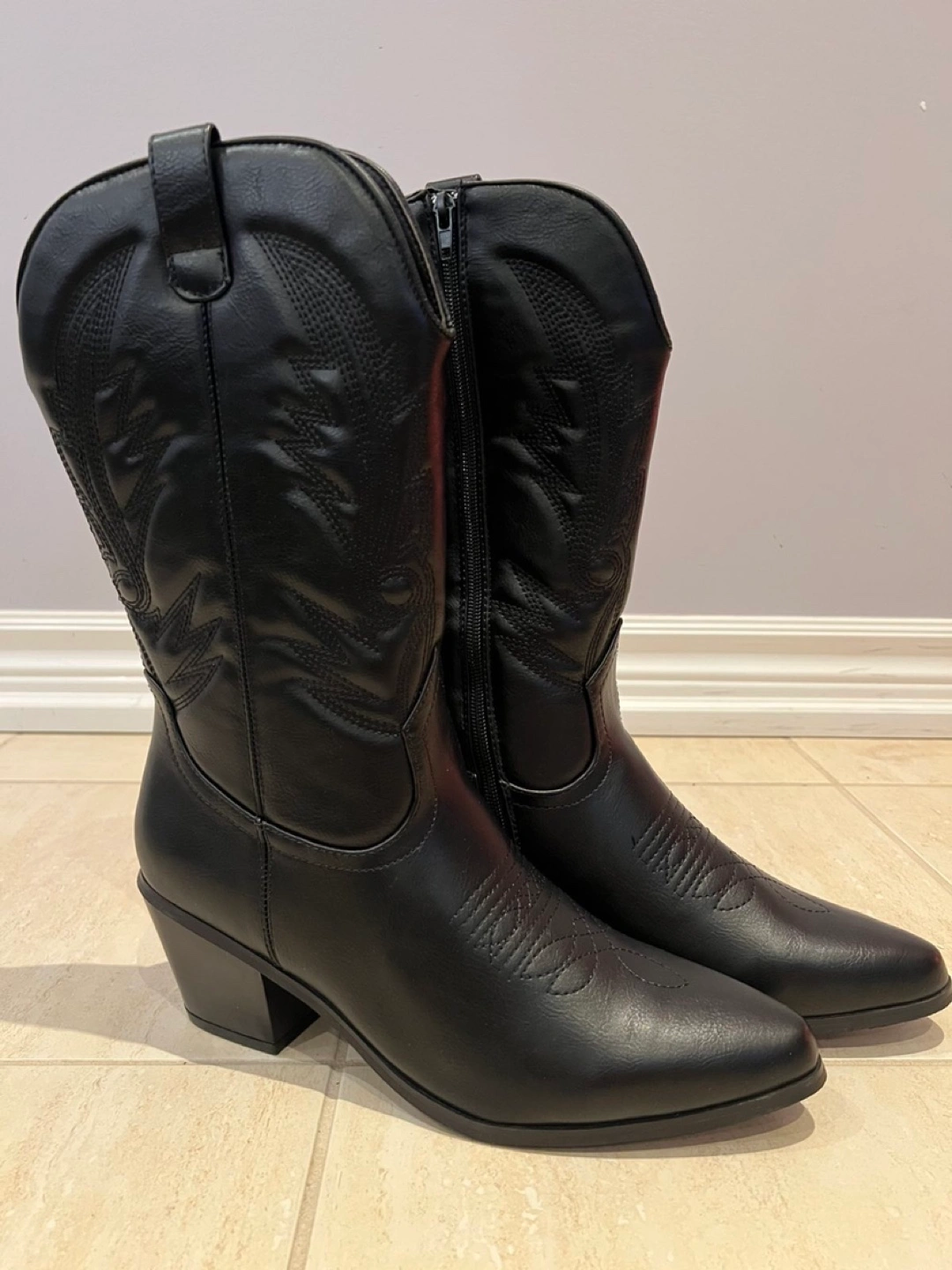 Women's black leather western style boots. Pointed toe, block heel. Side zipper closure. Embroidered detailing.