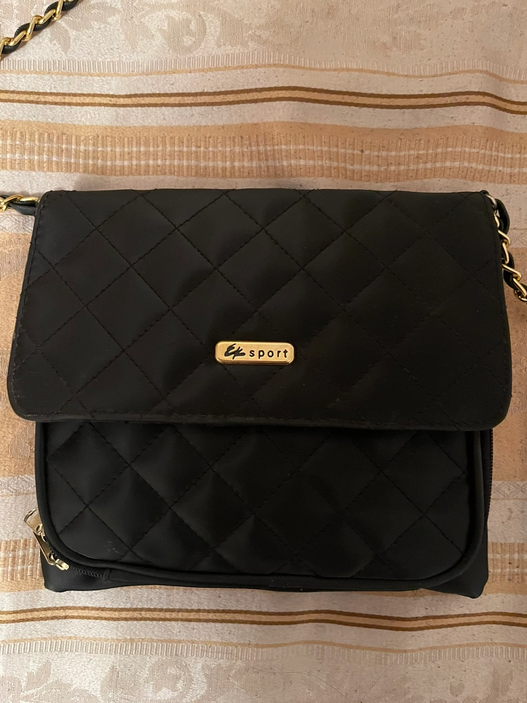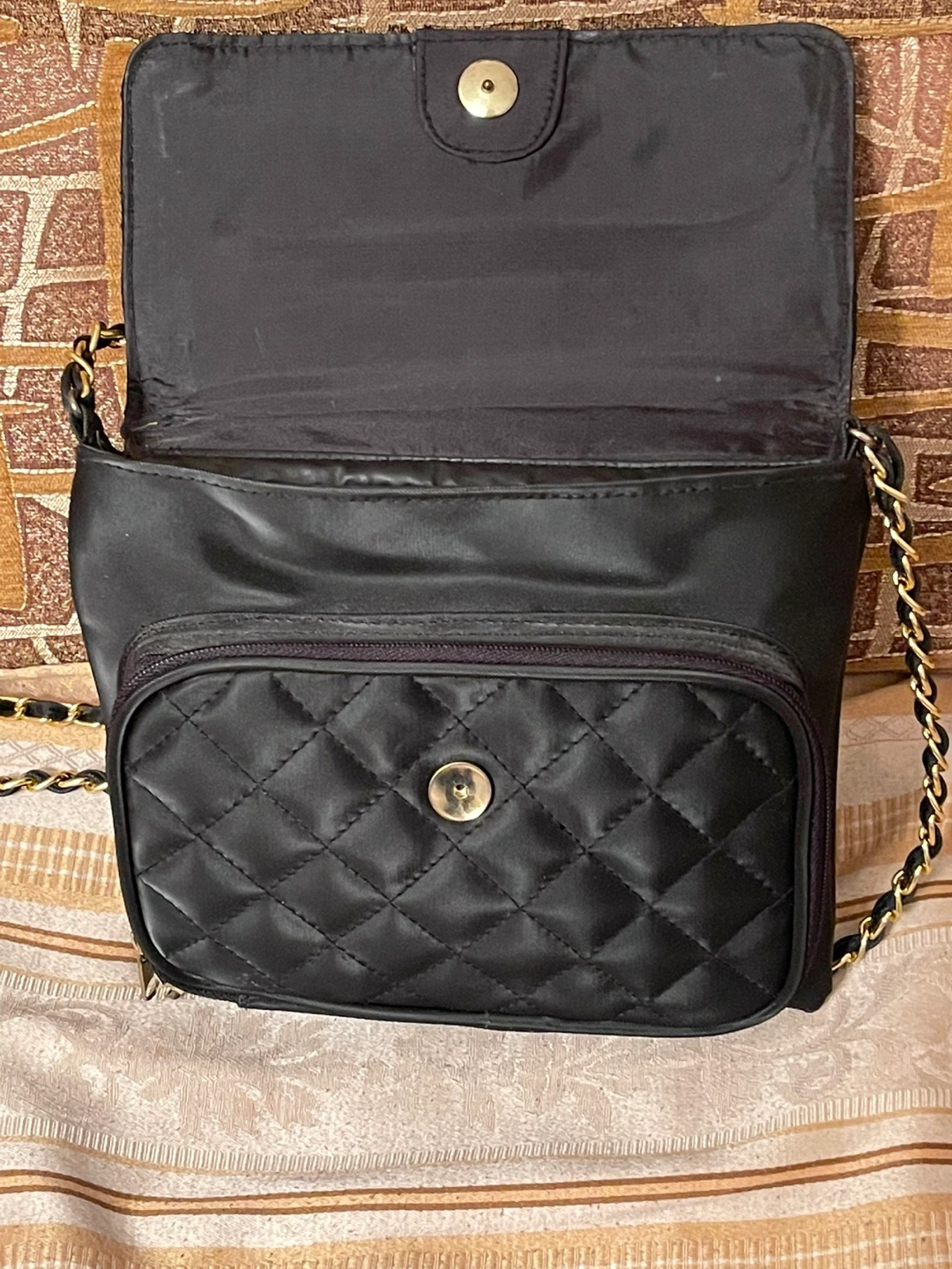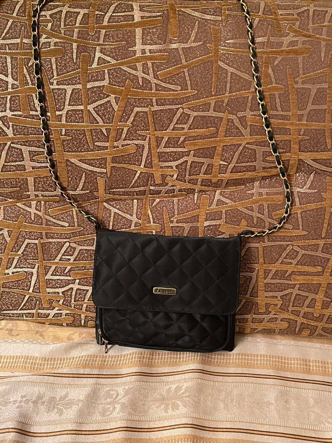 33Small black crossbody bag. Features quilted design, gold chain strap, and zipper closure. Multiple compartments. Perfect for everyday use and for travel to keep your belongings safe Price $14 negotiable