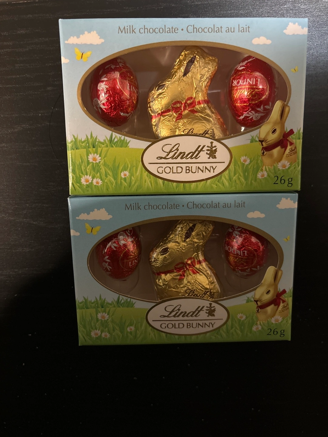 Two unopened boxes of Lindt Gold Bunny milk chocolate Easter treats. Each box contains one chocolate bunny and two chocolate eggs. 26g each. Best before 31/08/2024. ( take it if you wanna make it a decoration ONLY)
