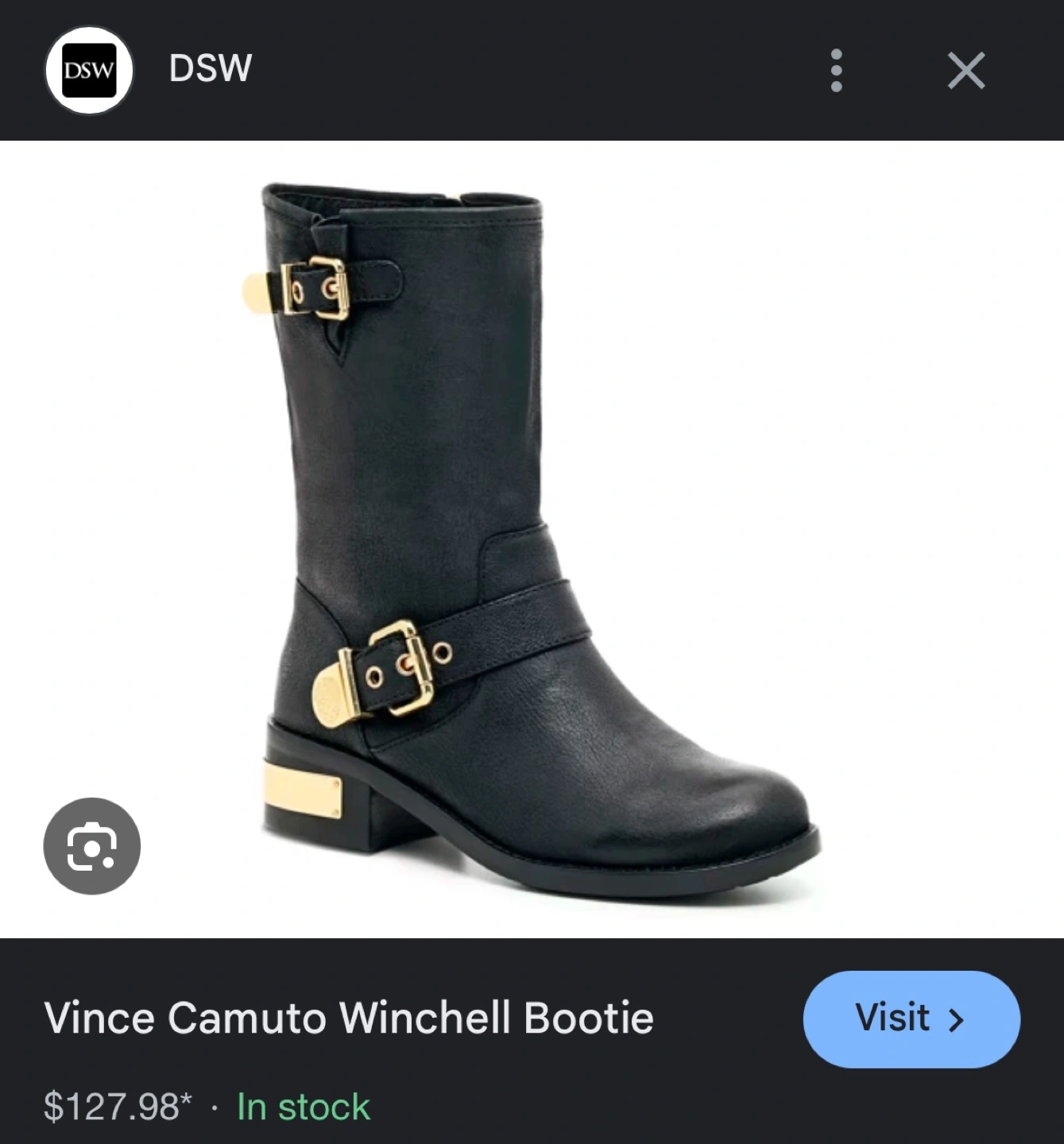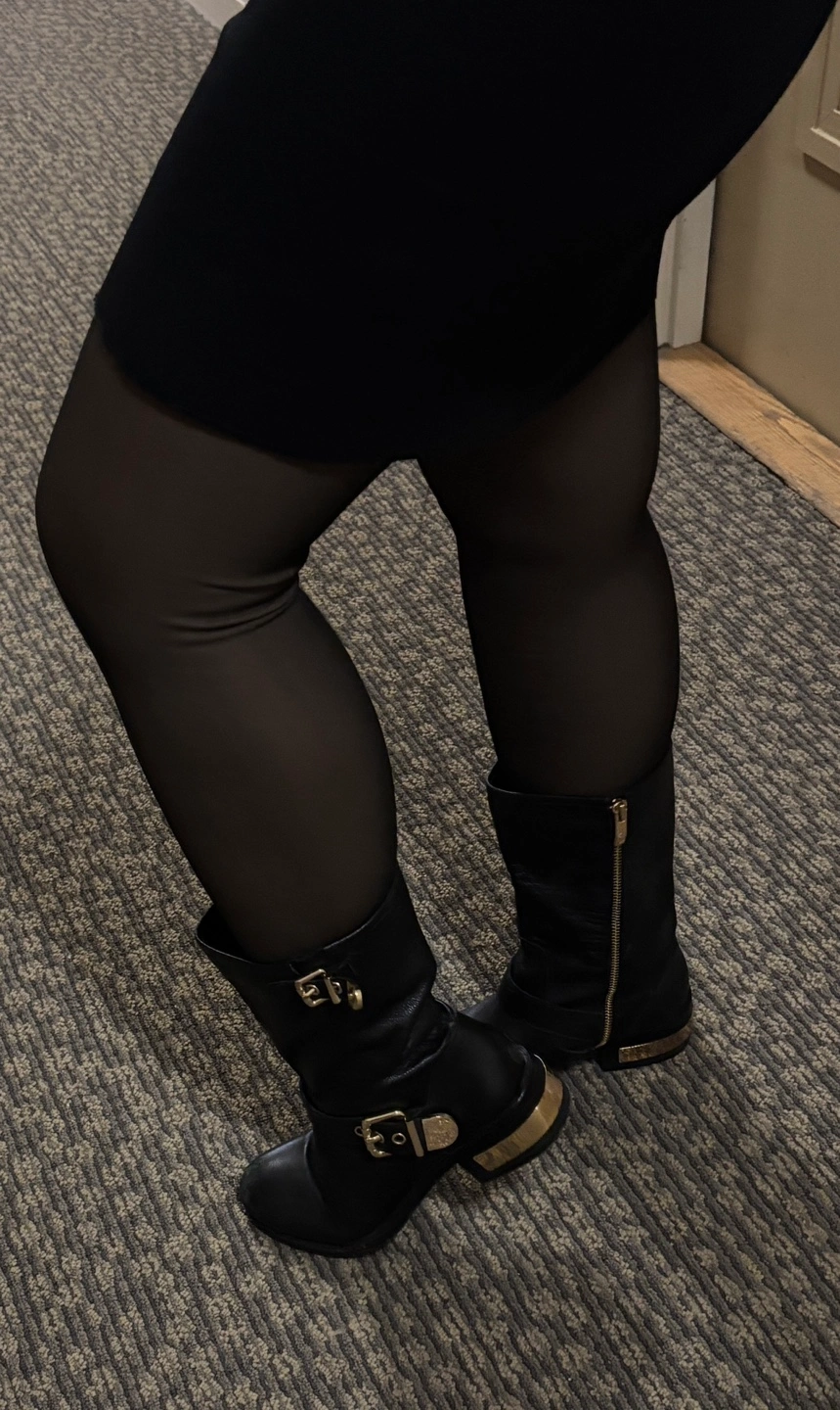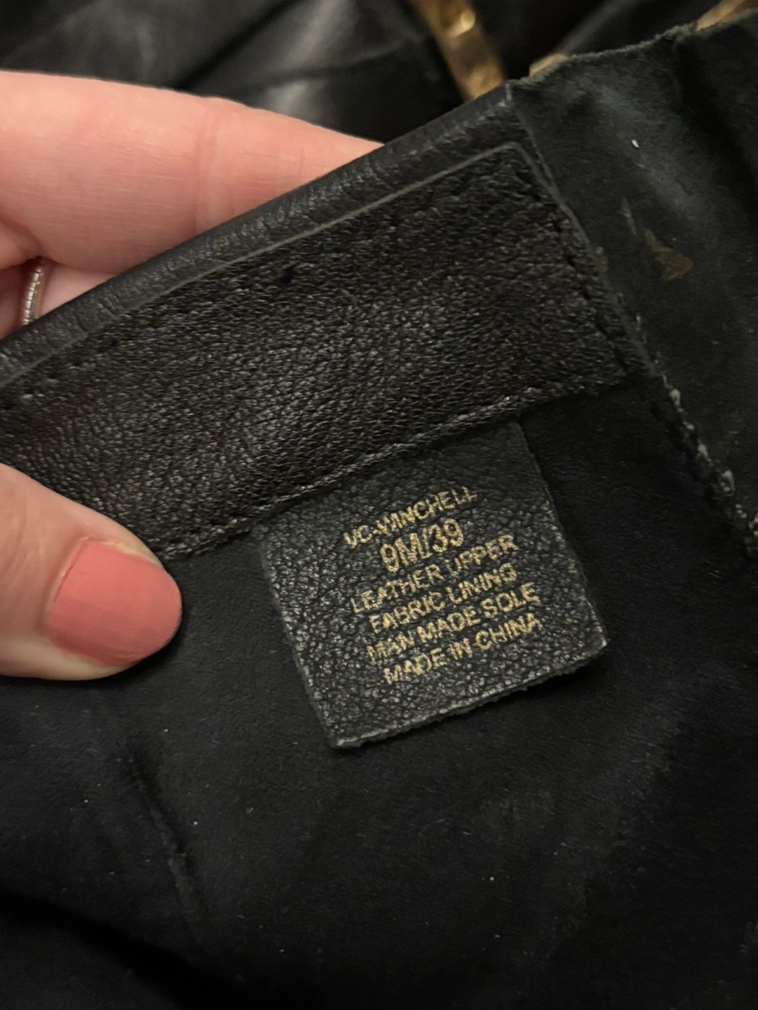 Black leather booties with gold accents. Side zipper closure. Buckle detail. Man-made sole. Retail price over $100