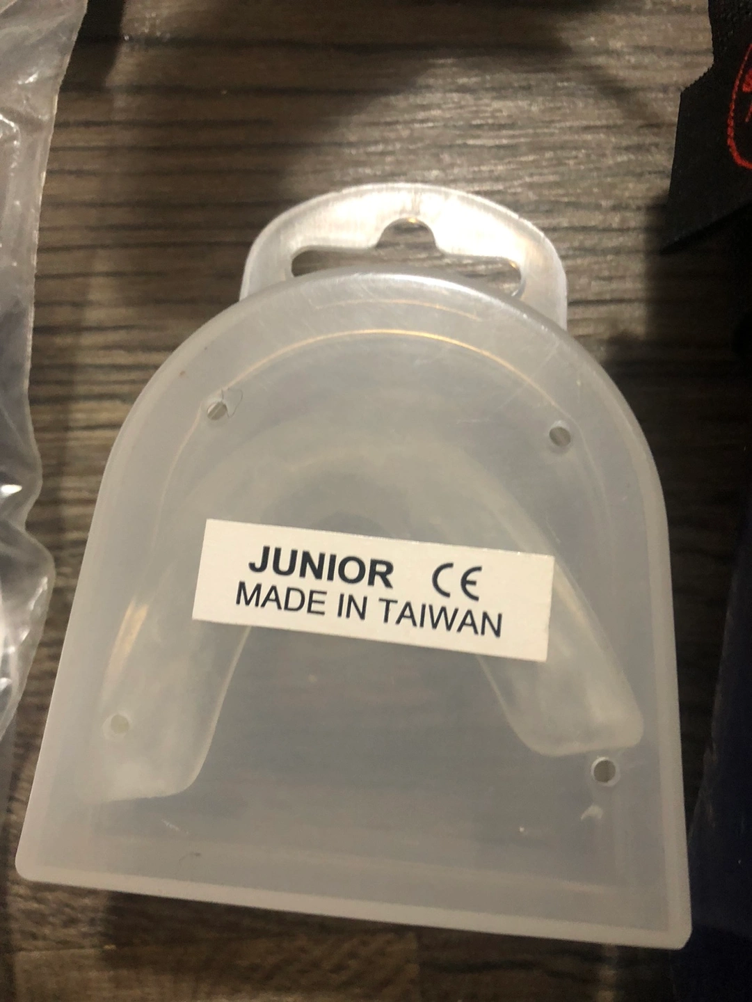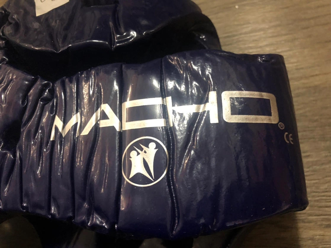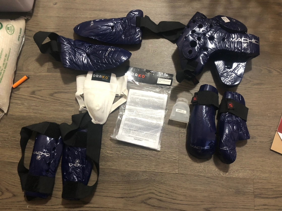 Complete junior martial arts protective gear set. Includes headgear, shin guards, hand guards, and groin guard. Macho brand headgear, shin guards and hand guards. Drako brand groin guard. Also includes a mouthguard. Like new condition used a few times only.