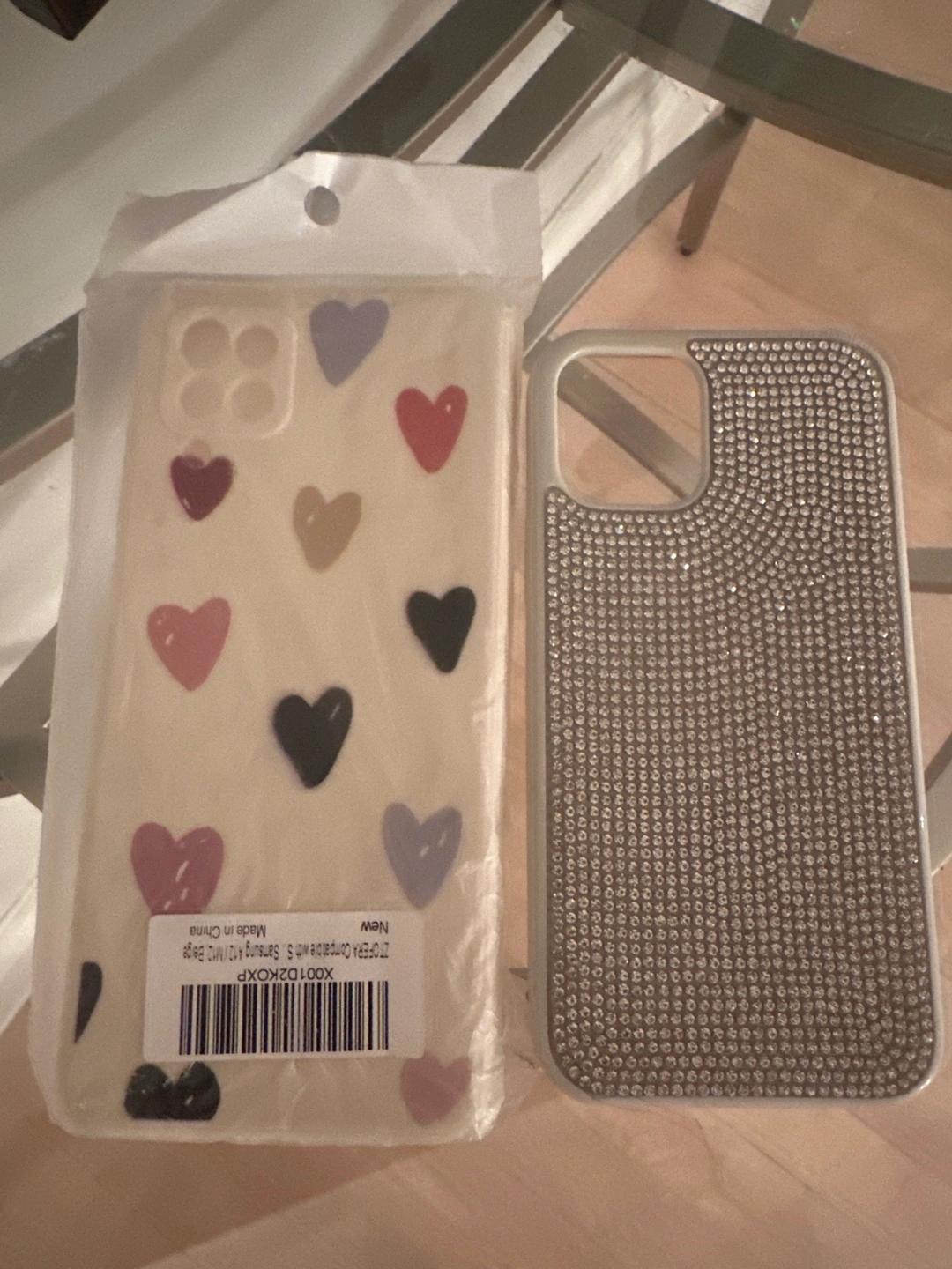 Two brand new phone cases. One features a cute heart design, the other is covered in sparkly rhinestones. Compatible with some Samsung models. Never used ! New