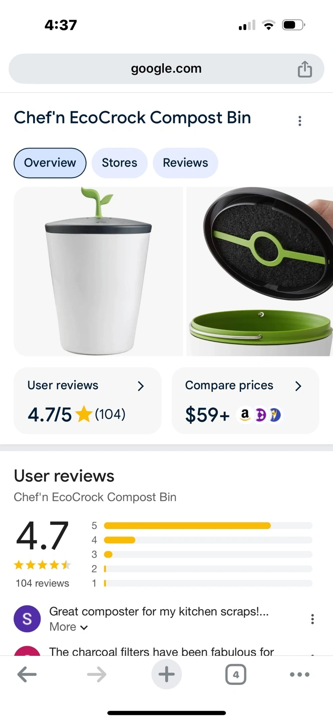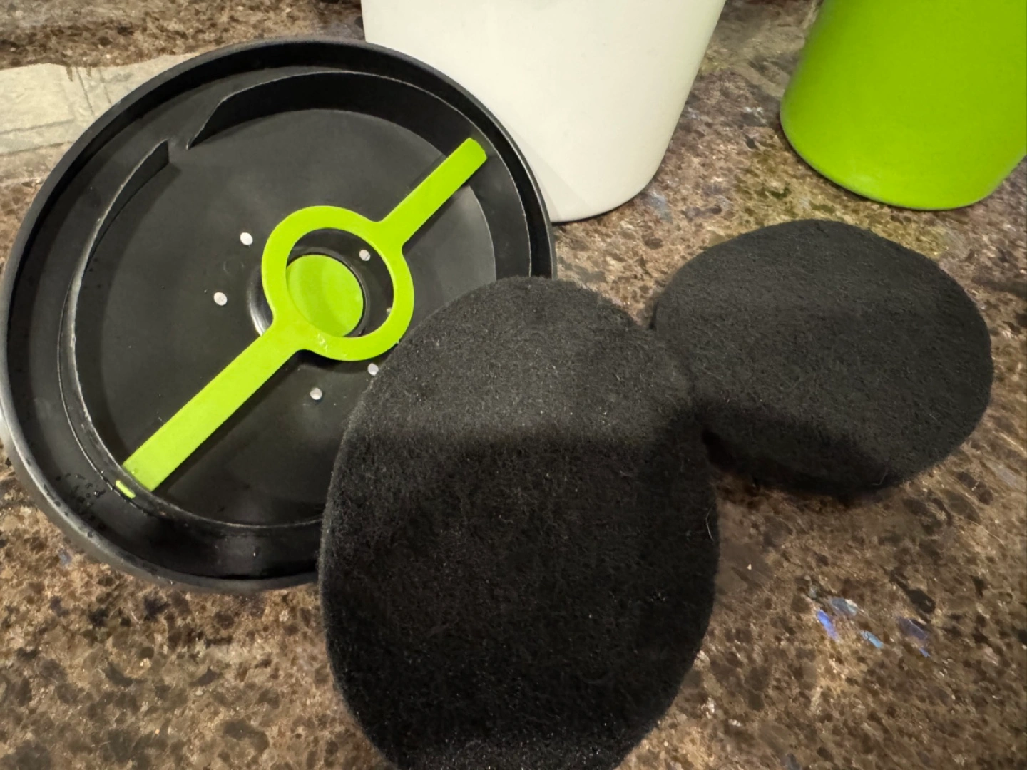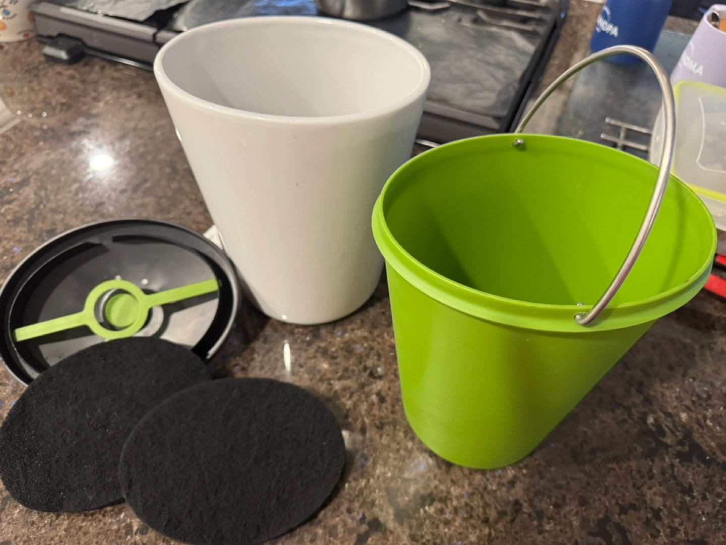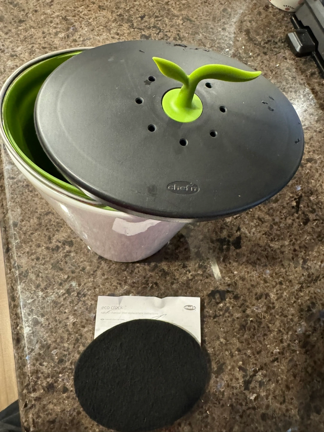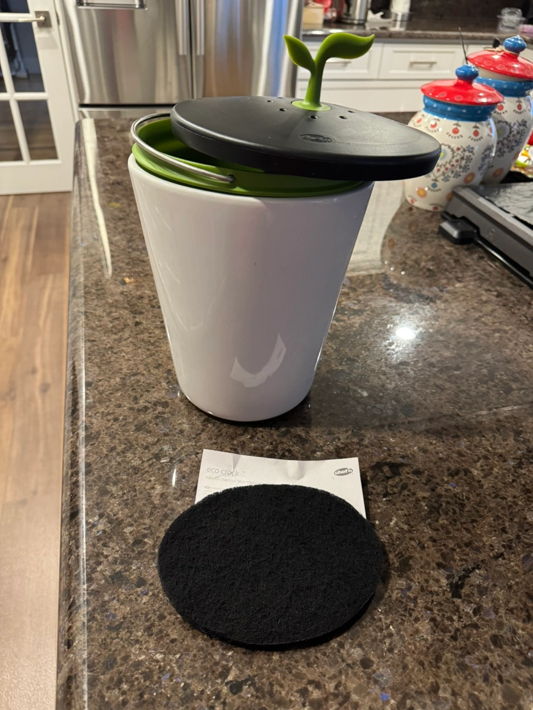 Countertop compost bin. Includes inner plastic container with handle, and outer ceramic container, lid, and charcoal filters. Great for kitchen scraps. Easy to clean. New sells for $ 60.00