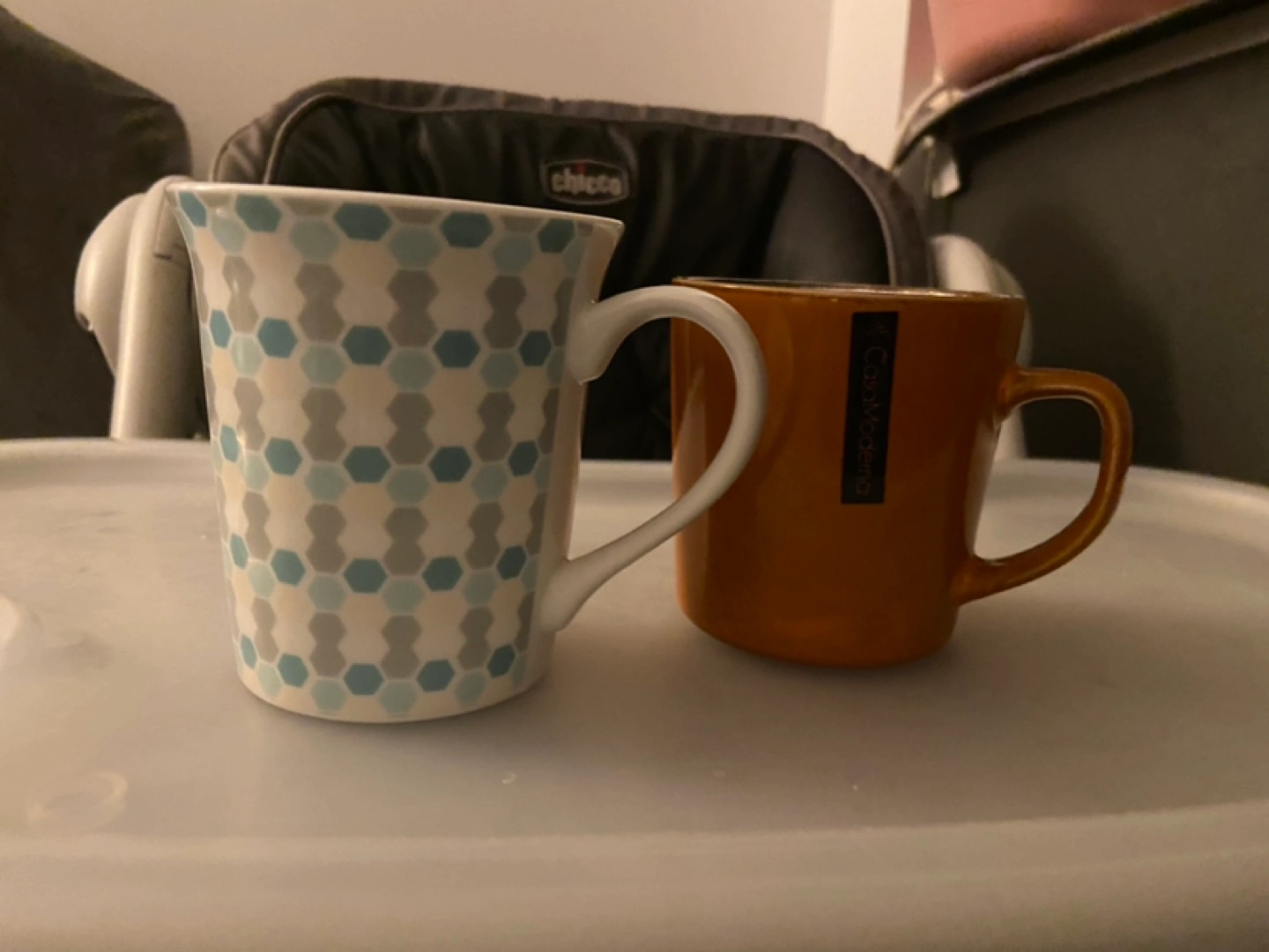 Set of two mugs. One features a geometric pattern in teal, grey and white. The other is a solid brown colour. Both are in good used condition.
