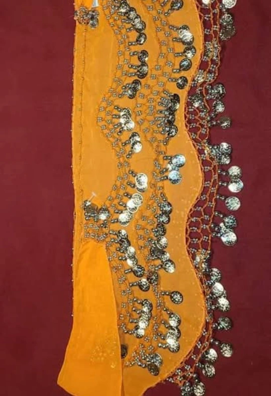 This lovely orange chiffon hip scarf is adorned with decorative silver coins and beaded accents. It would be perfect for belly dancing or costume use, and it's brand new and unworn! π§‘β¨π #chiffon #scarf #coins #beads #bellydancing #costume. I got it in Turkey.