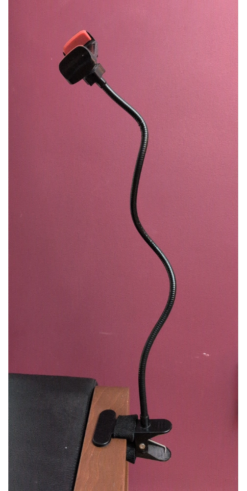 Black phone holder with flexible gooseneck and sturdy clip. Red accents on phone holder. Attaches easily to tables or desks.