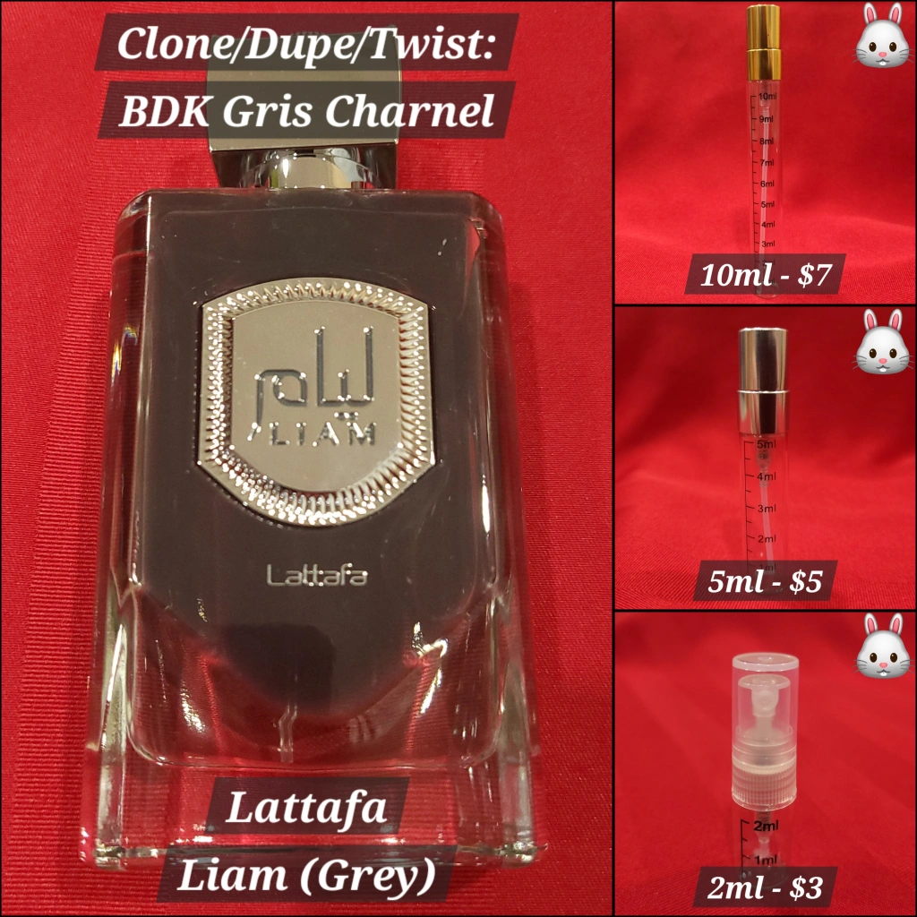 Lattafa Liam (Grey) perfume, a clone of BDK Gris Charnel. Available in 2ml, 5ml, and 10ml decants.