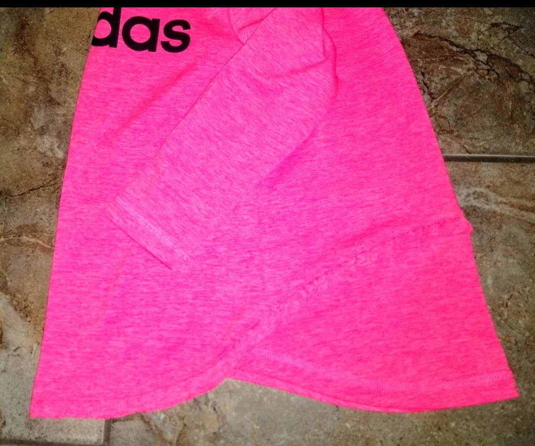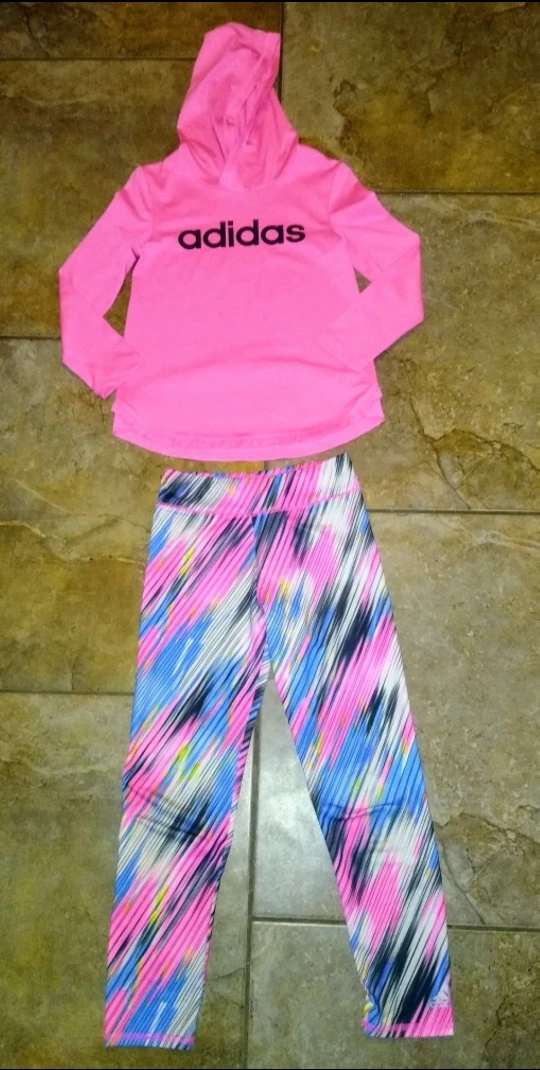Authentic Adidas girl's bright pink hooded pullover top with colourful leggings activewear outfit.