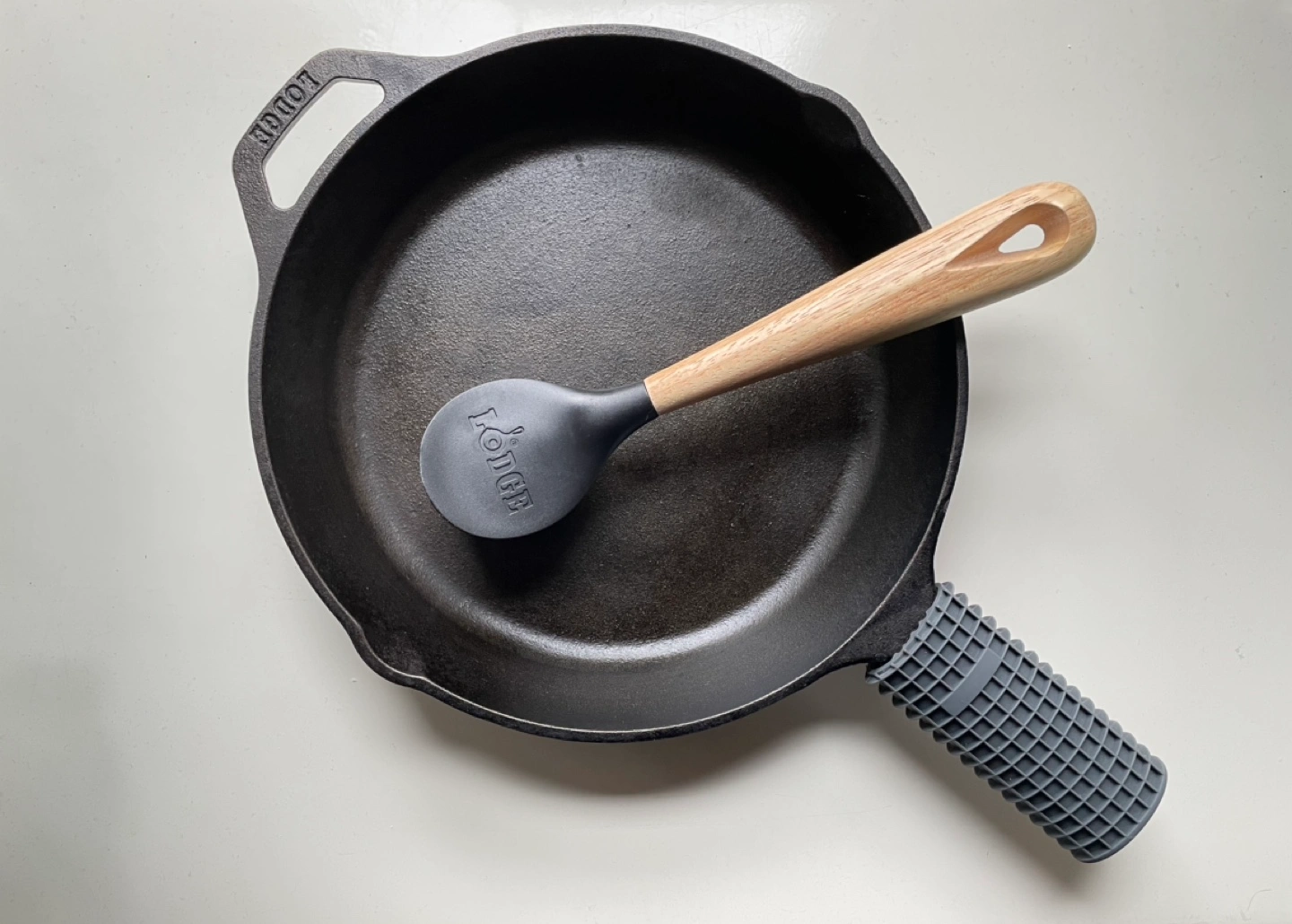 Pre-seasoned cast iron skillet by Lodge. Great for cooking. Includes silicone grip and cleaning brush. Durable and long-lasting.