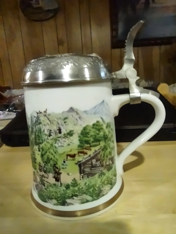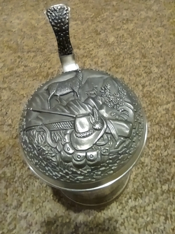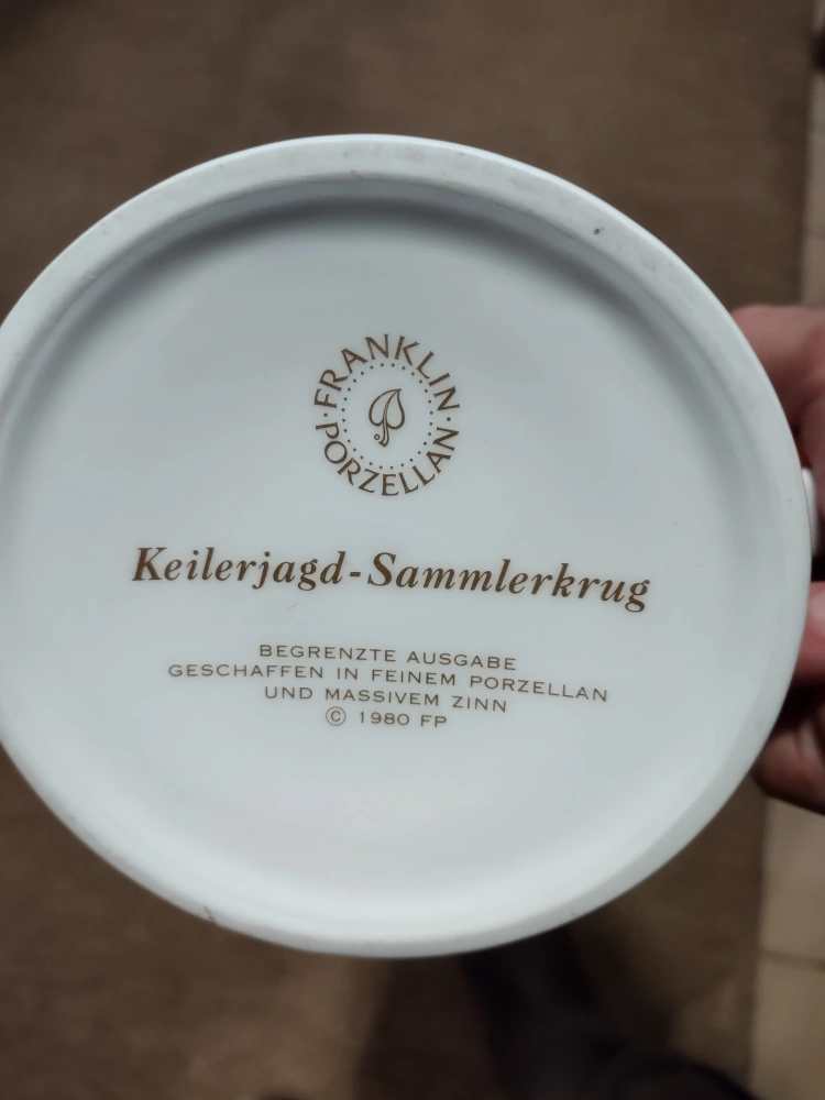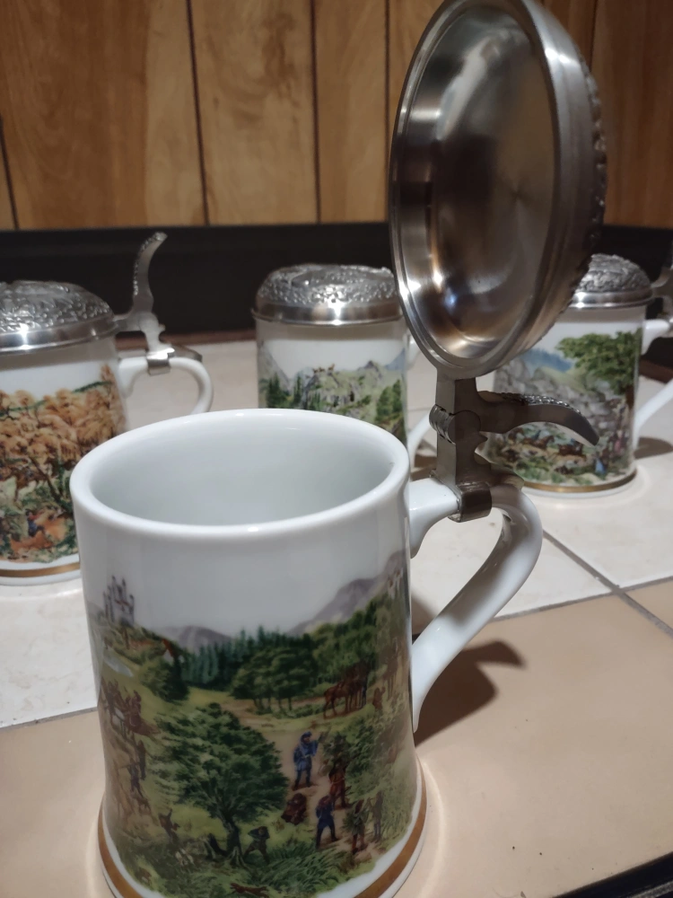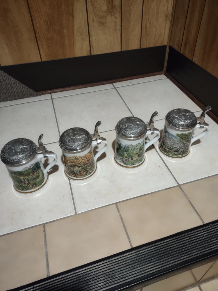 German made four beautiful collector's steins with pewter lids depicting various 19th century German hunting scenes. Franklin porcelain 1979-80 issue in excellent condition.