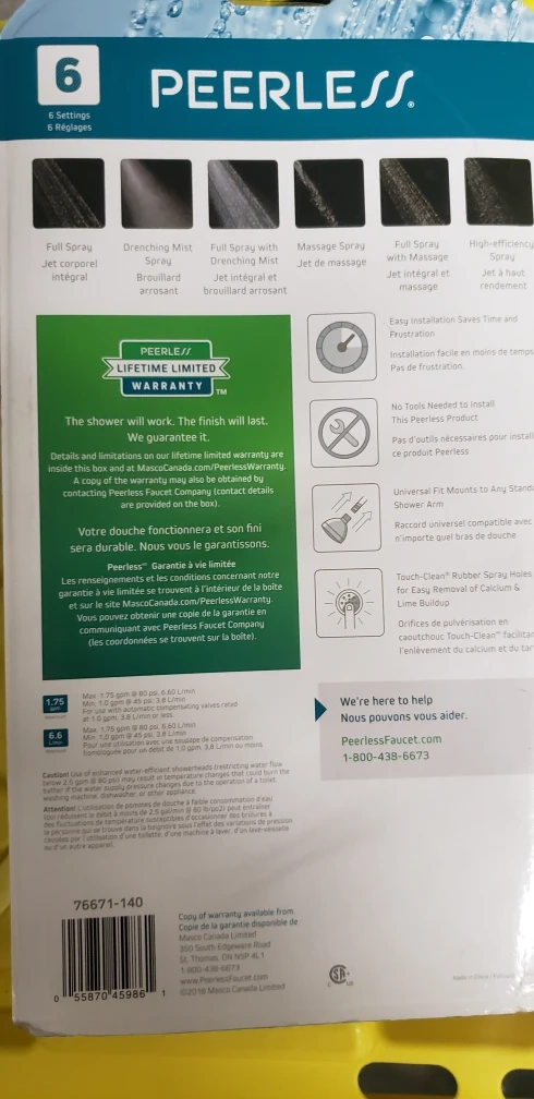 New in package. Massage hand shower head. 6 spray settings. 60 inch flexible hose. Easy installation.