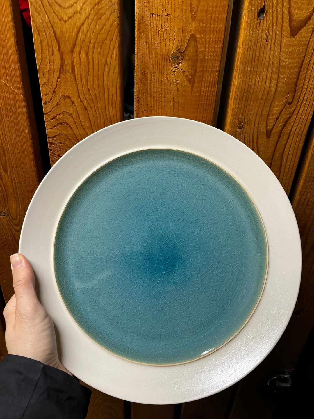 Beautiful ceramic mug and plate set. Teal crackle glaze. White exterior. Large mug, perfect for coffee or tea, matching plates (2 different sizes).