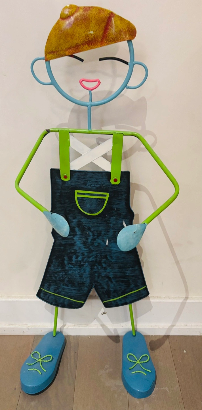 Cute metal figurine. Boy wearing overalls and hat. Fun colourful design. Great for home decor.