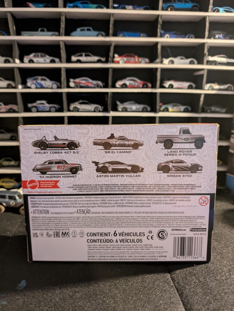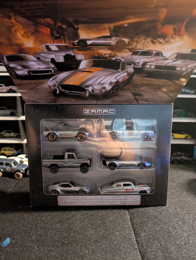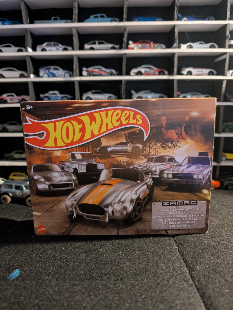 New in box Hot Wheels Zamac 6-car set. Includes Shelby Cobra 427 S/C, '68 El Camino, Land Rover Series III Pickup, Aston Martin Vulcan, Nissan 370Z, and '52 Hudson Hornet. Collectible die-cast metal cars.