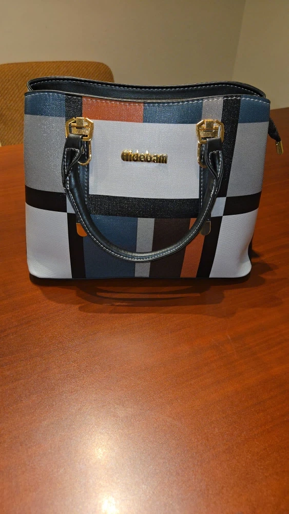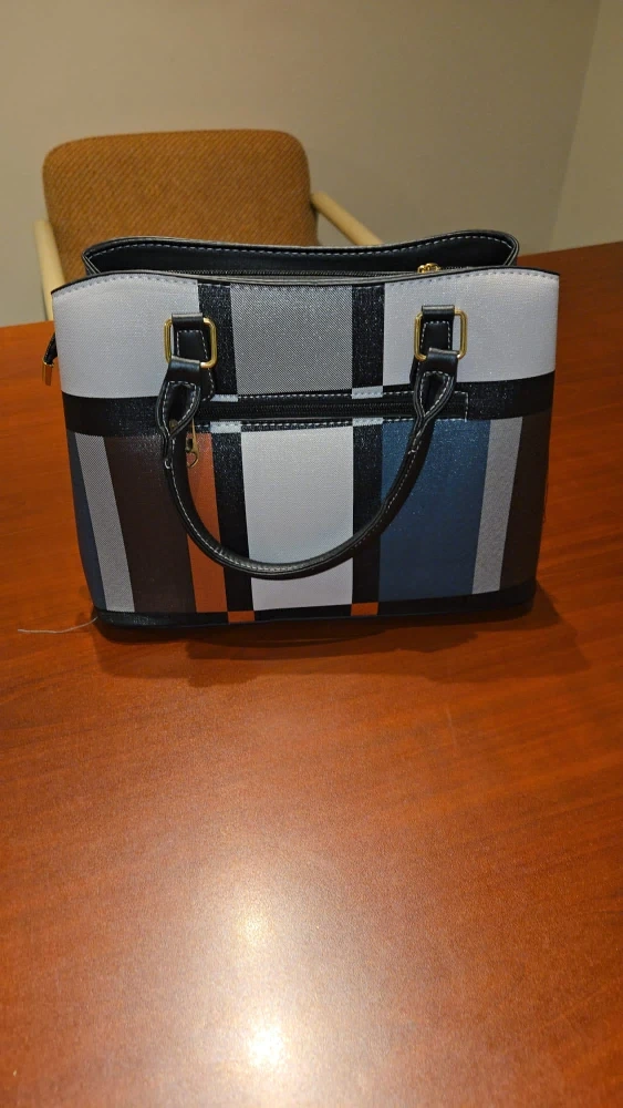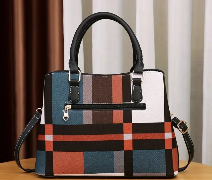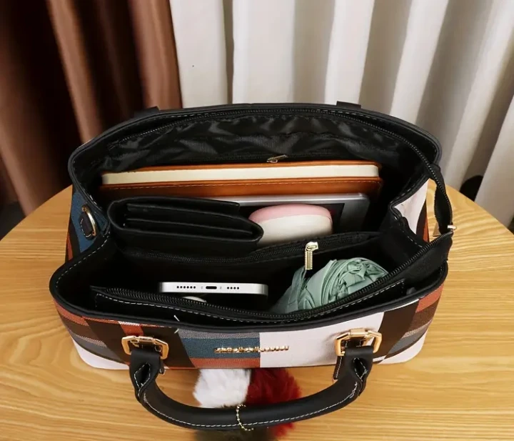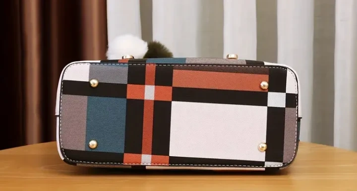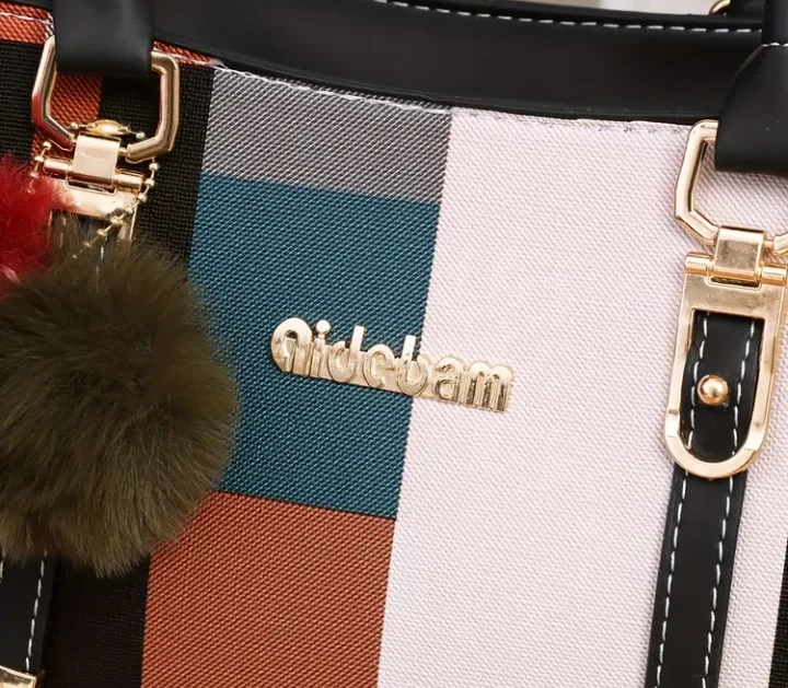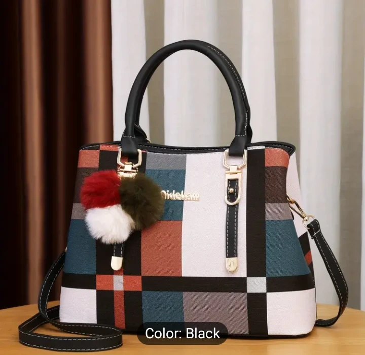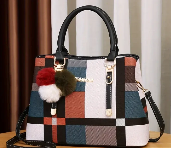 Stylish handbag, features a plaid pattern. Multiple compartments. Includes a detachable shoulder strap and a cute pom-pom charm. Perfect for everyday use.