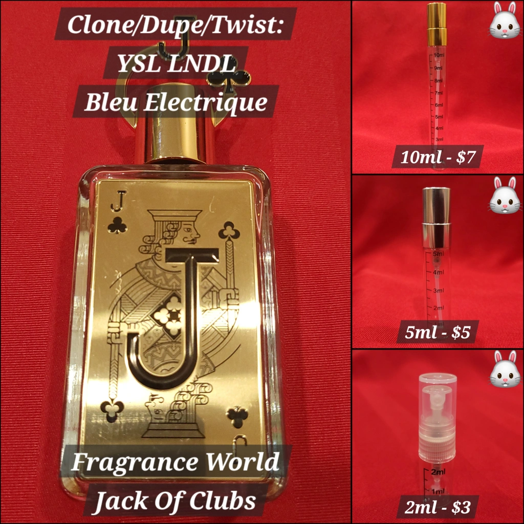 10ml, 5ml and 2ml decants available. Clone/Dupe/Twist of YSL LNDL Bleu Electrique. Gold bottle, Jack of Clubs design.