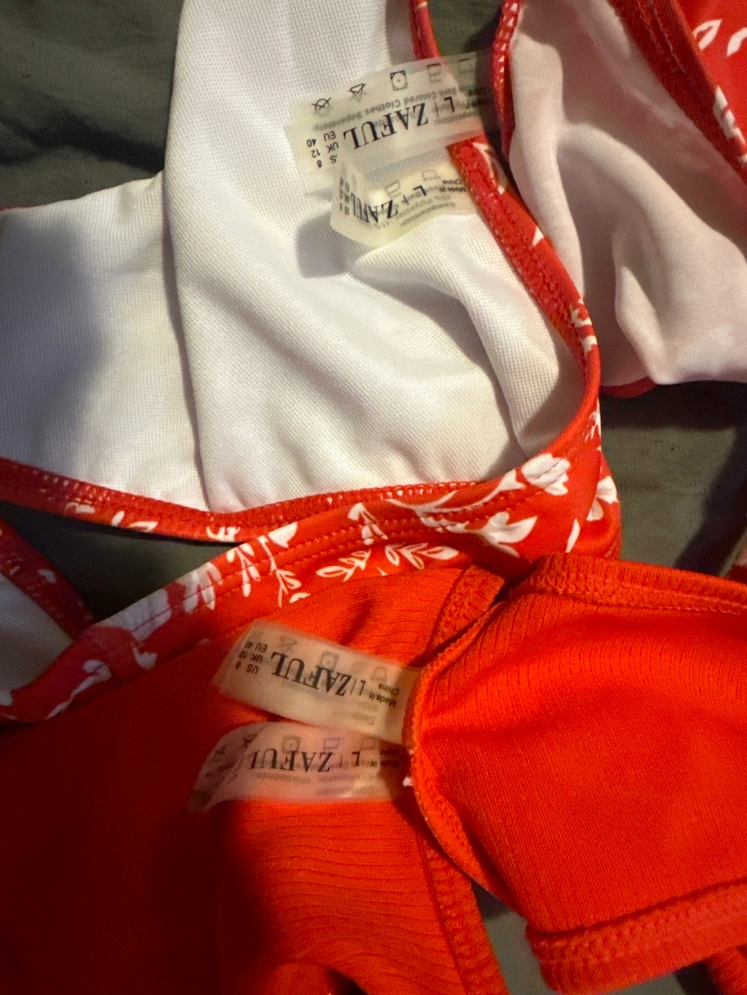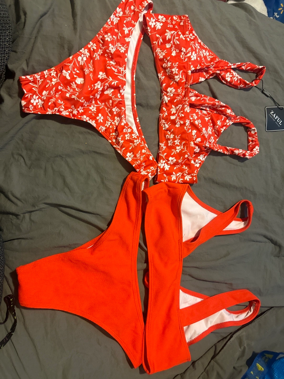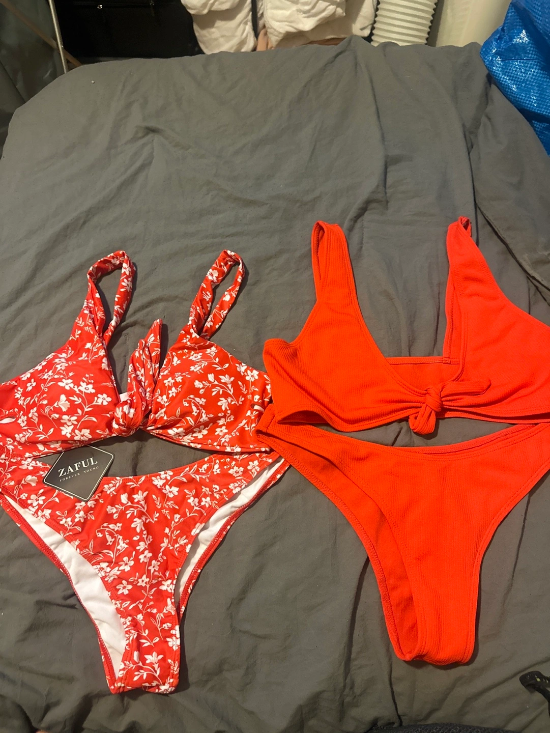 Two orange bikinis. One floral print, one solid. Both feature a tie-front top and high-cut bottoms. Size large for all pieces. $20 each set or $40 for both sets