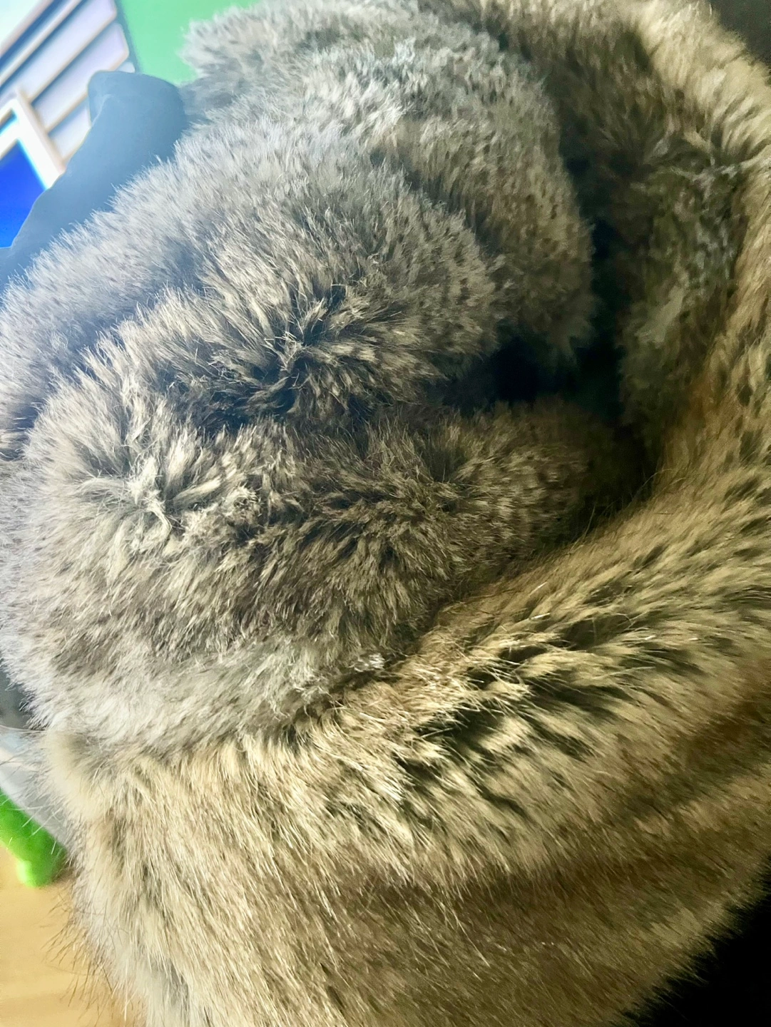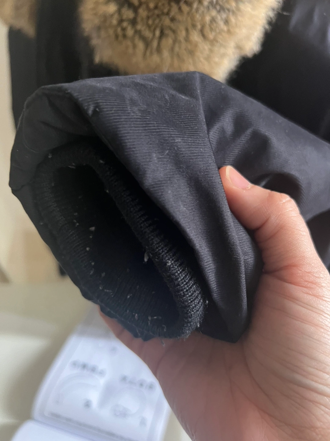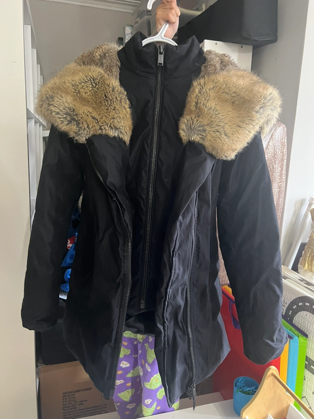 Warm winter jacket. Black colour. Features a faux fur lined hood and a down-filled design. Size small.