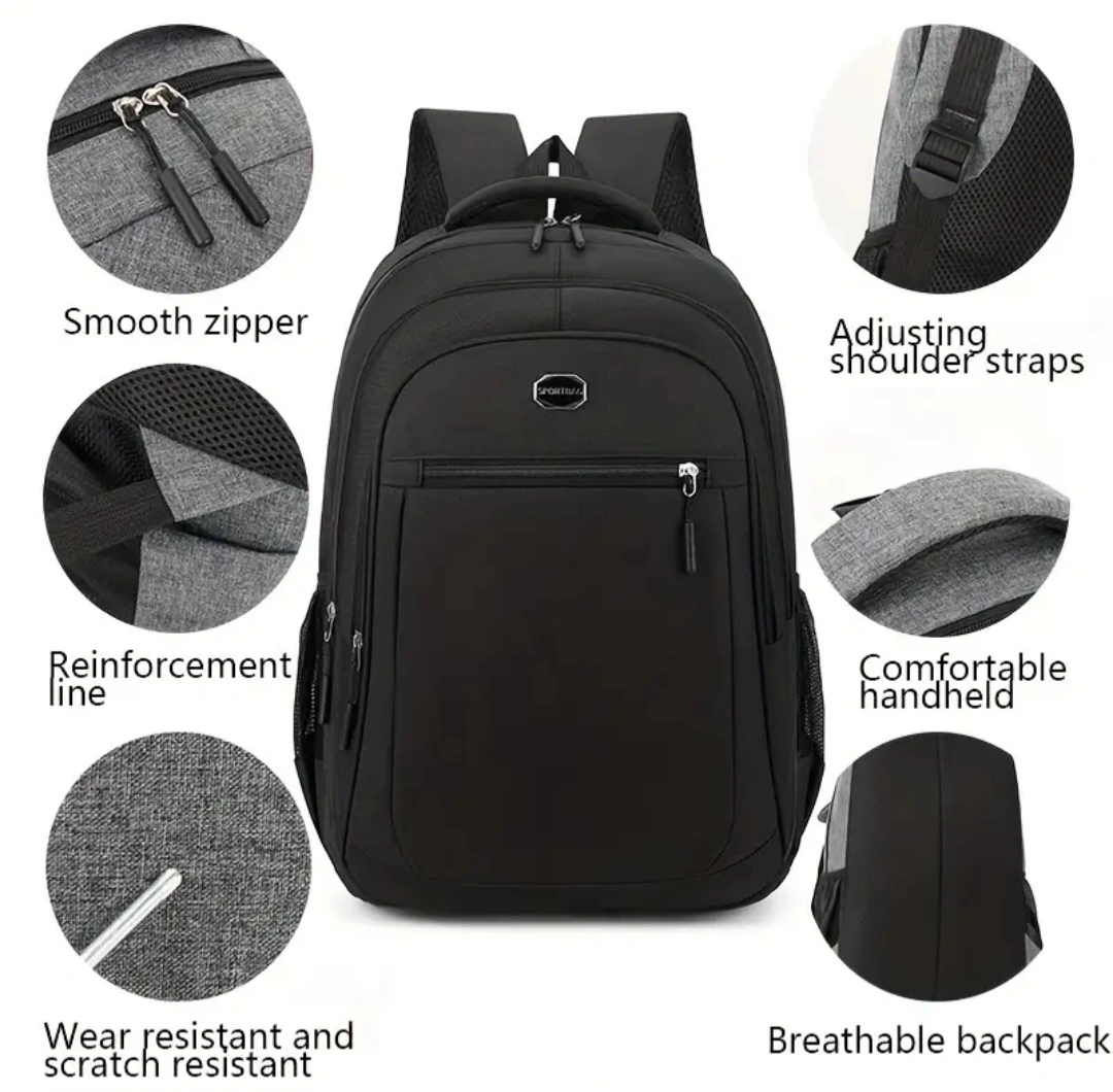 Large capacity backpack. Multiple compartments and pockets. Adjustable shoulder straps. Comfortable handheld. Smooth zippers. Wear-resistant and scratch-resistant material. Breathable design. Perfect for school, work, or travel.