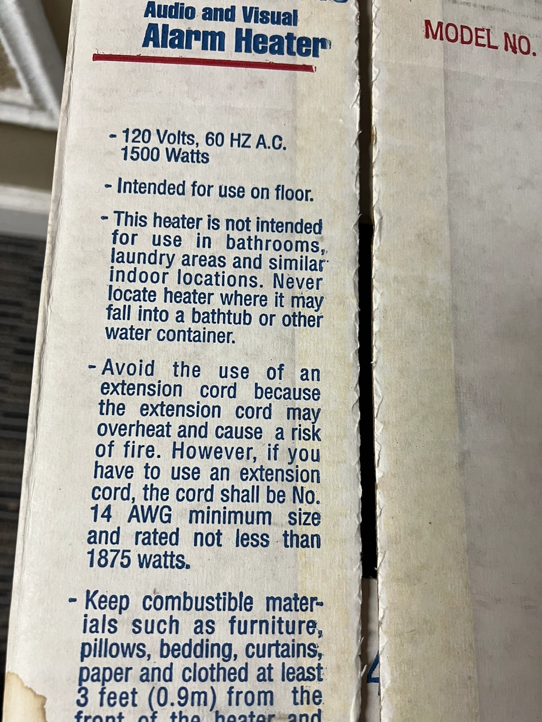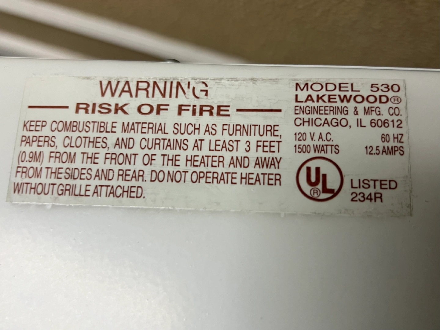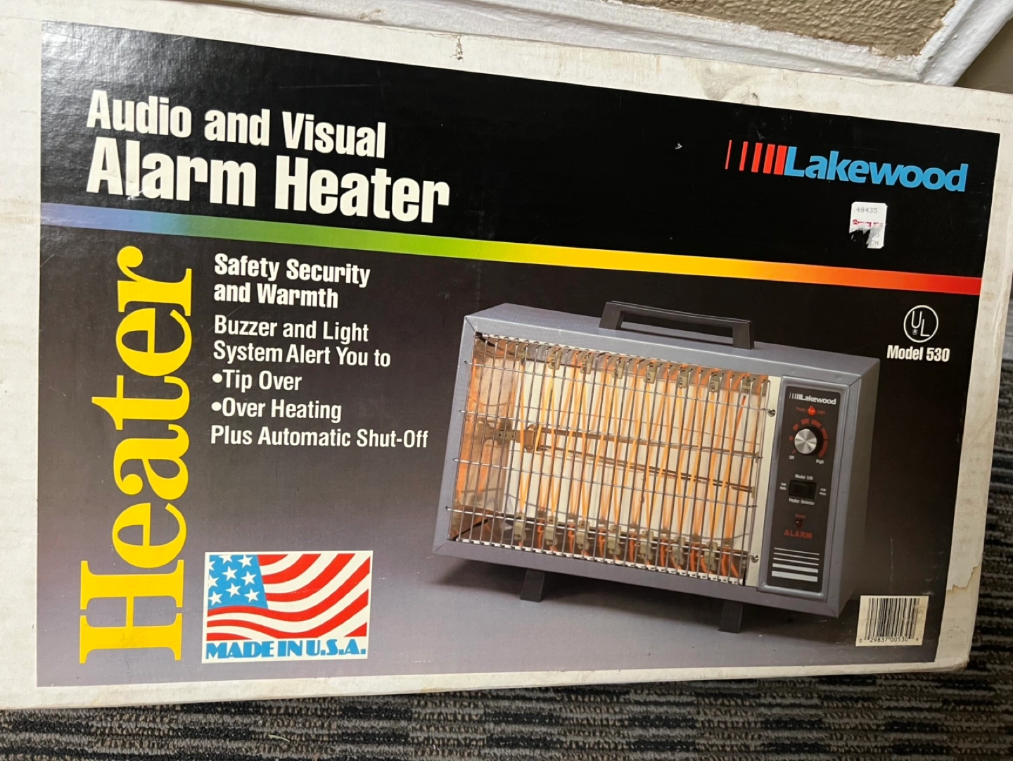 Vintage Lakewood Model 530 alarm heater. Safety features include tip-over and overheat protection. Automatic shut-off. Made in the USA. 1500 watts.