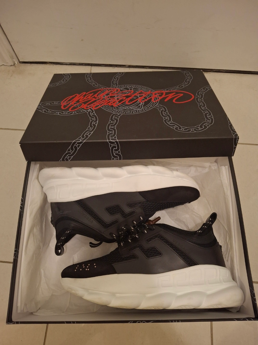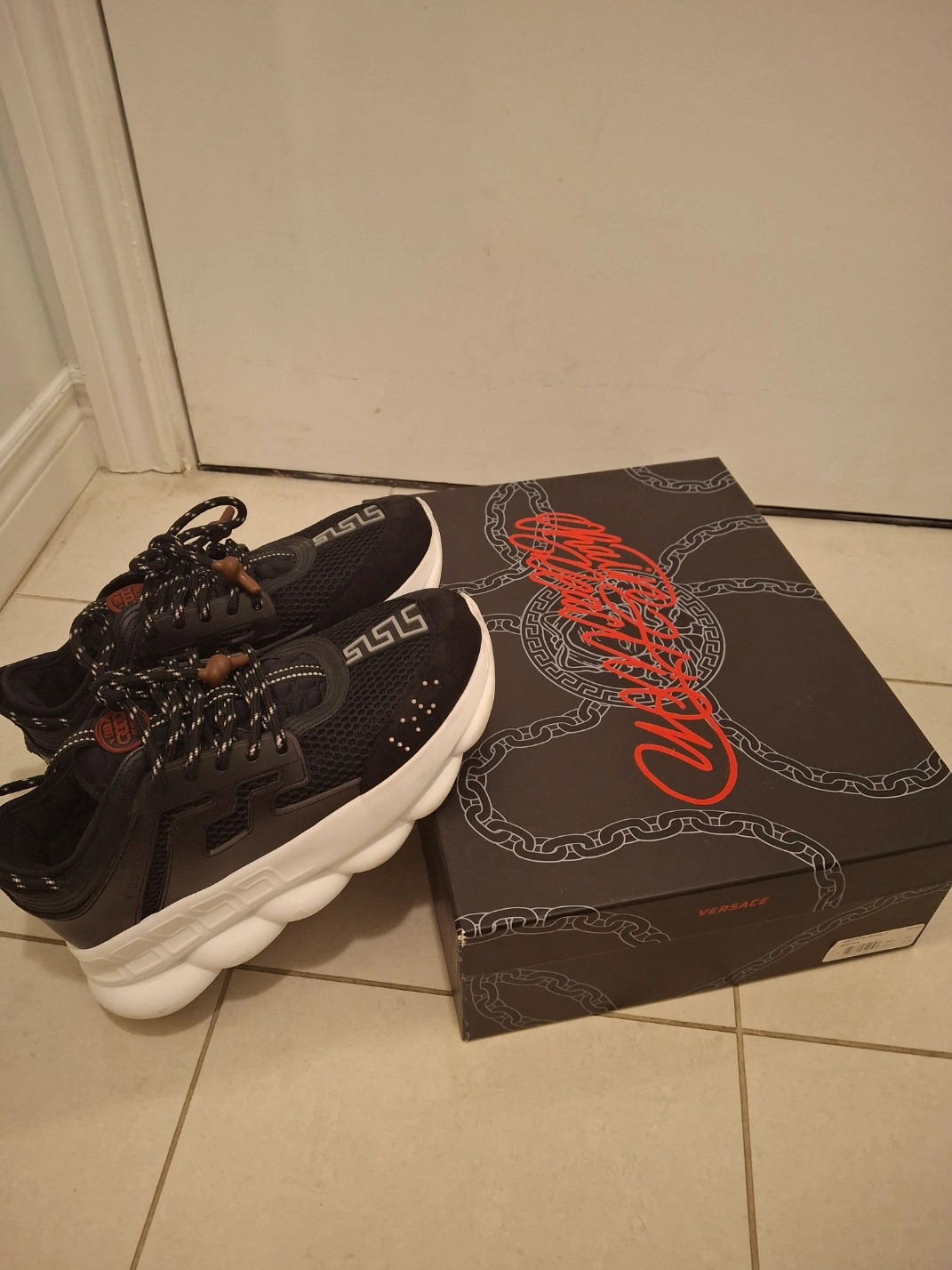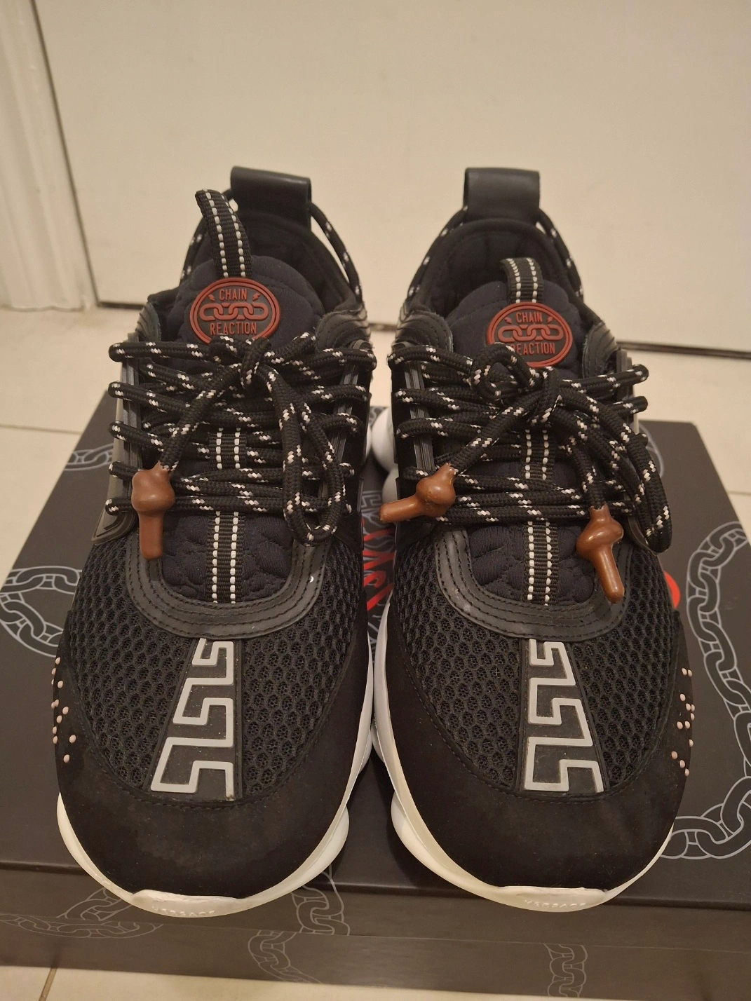 Pre-owned Versace Chain Reaction sneakers. Black colourway. Size 8. Comes in original box. Slight wear may be present.