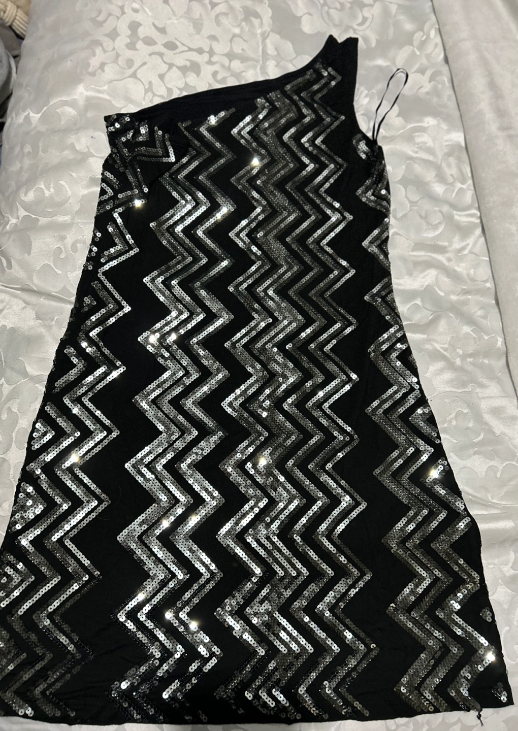 Black mini dress. One shoulder design. Silver sequin zig-zag pattern. Great for a party or special occasion.