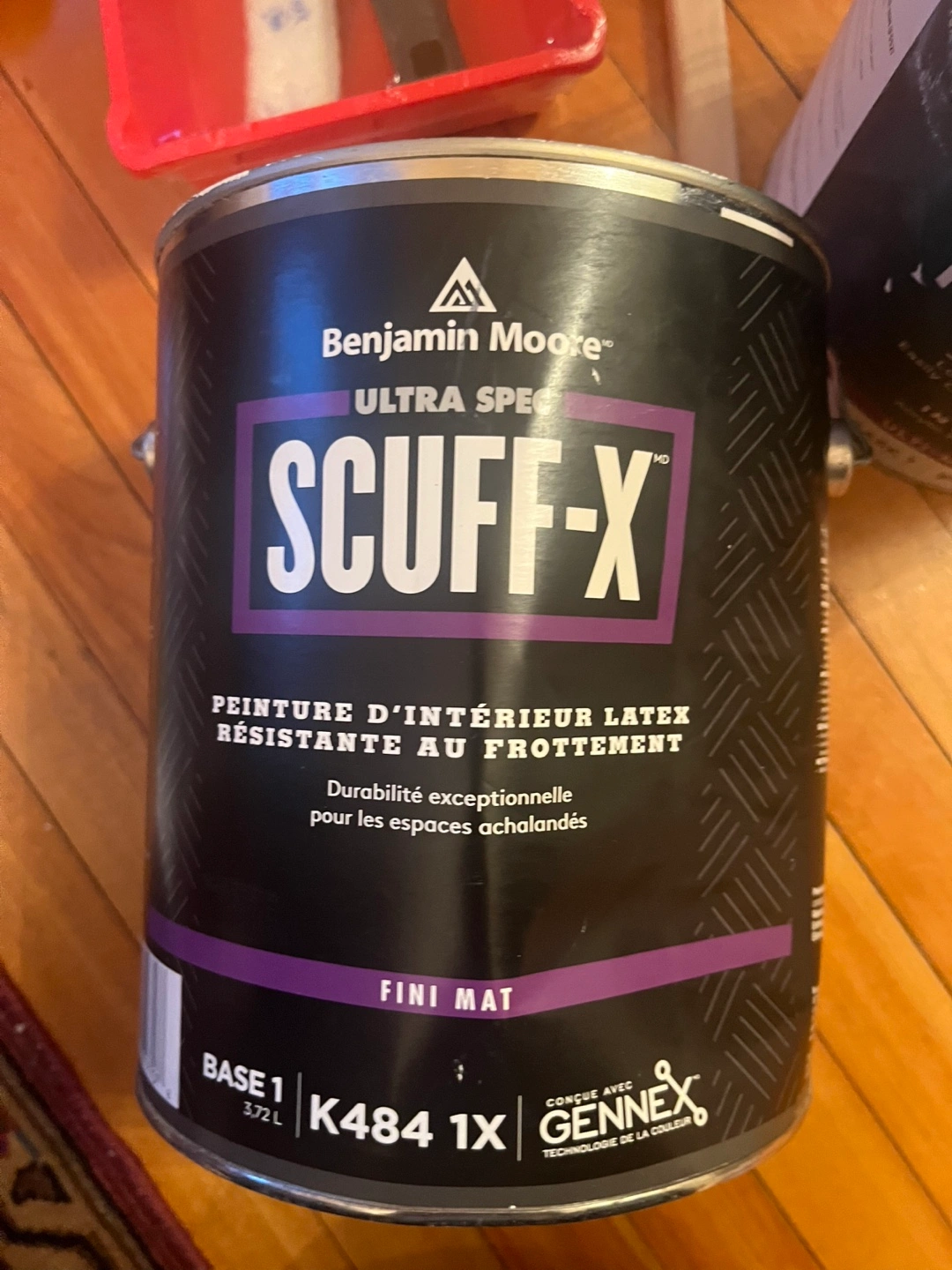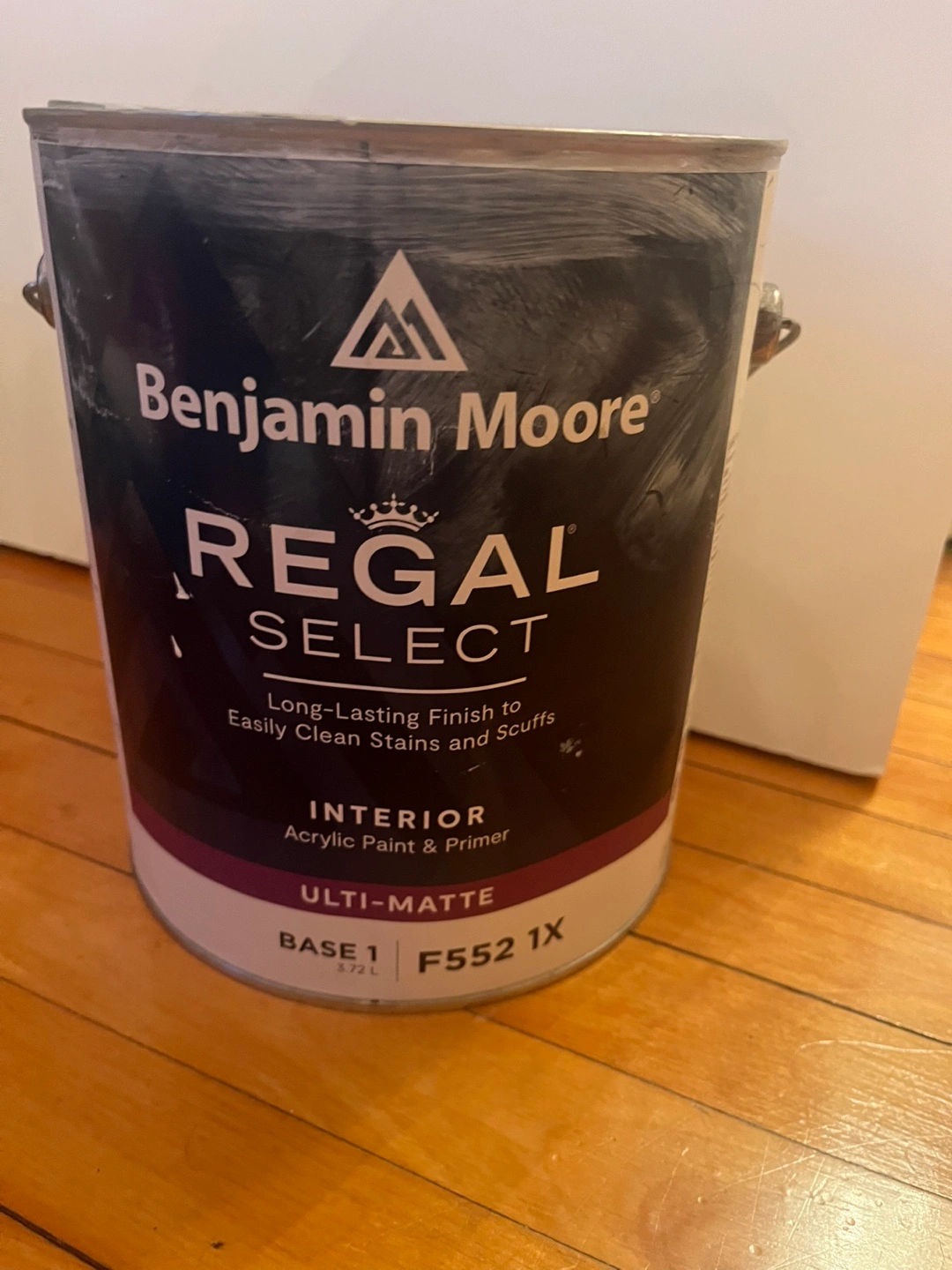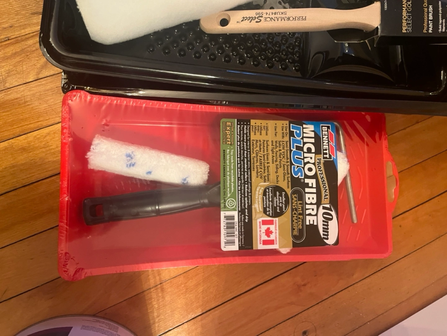 New and used painting supplies bundle. Includes two cans of Benjamin Moore paint, one Scuff-X and one Regal Select. Various rollers and brushes. Paint trays included. Great for your next painting project.