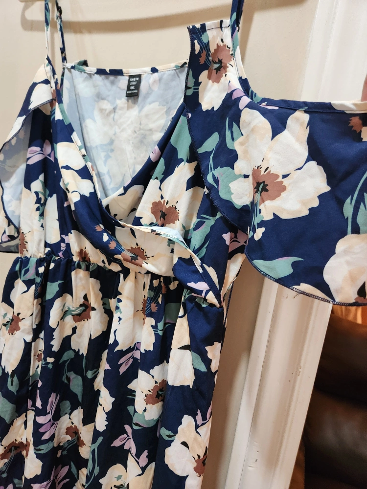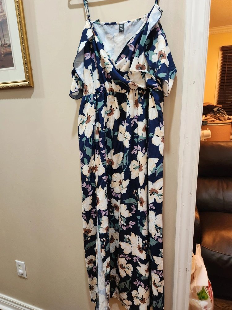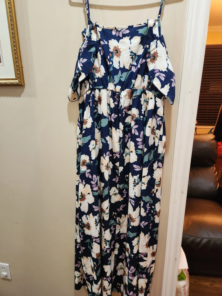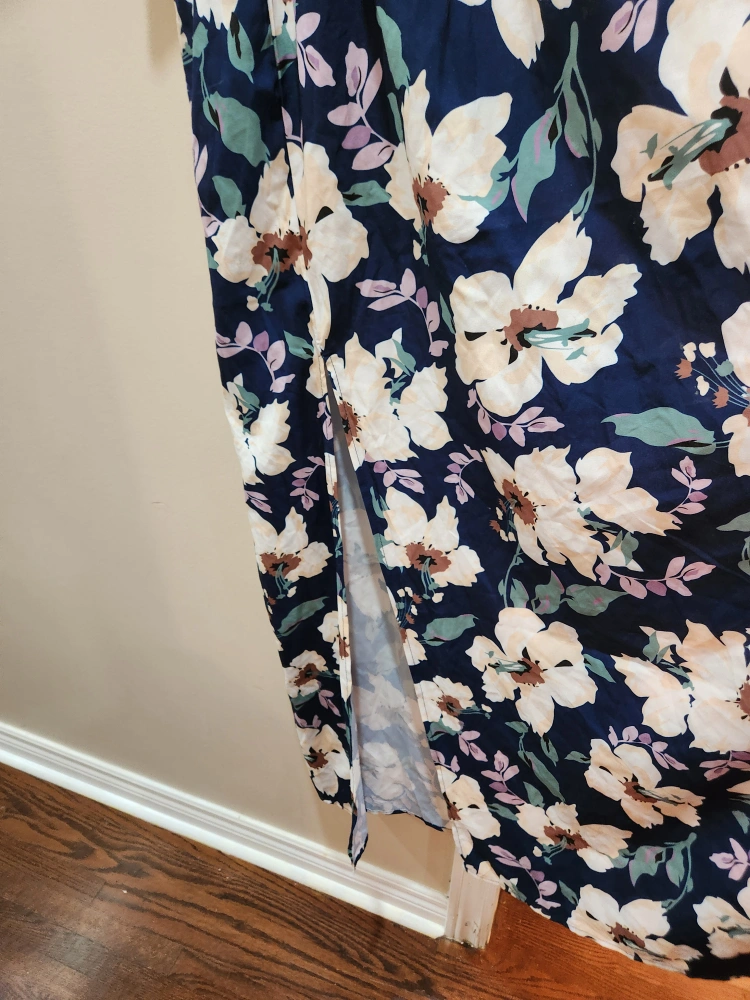 Beautiful navy blue maxi dress. Features a floral print, cold-shoulder detail, and a thigh-high slit. Lightweight and flowy fabric. Perfect for summer events.