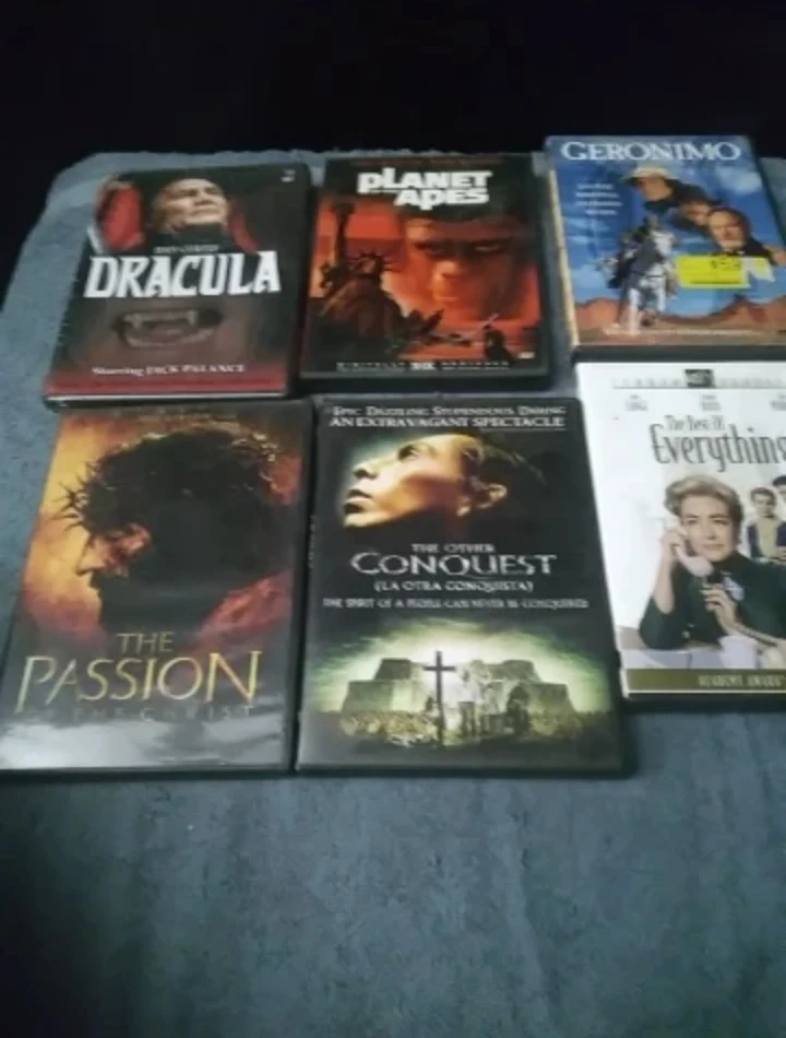 Six used DVDs. Titles include Dracula, Planet of the Apes, Geronimo, The Passion of the Christ, The Other Conquest, and The Price of Everything. Various actors and directors.