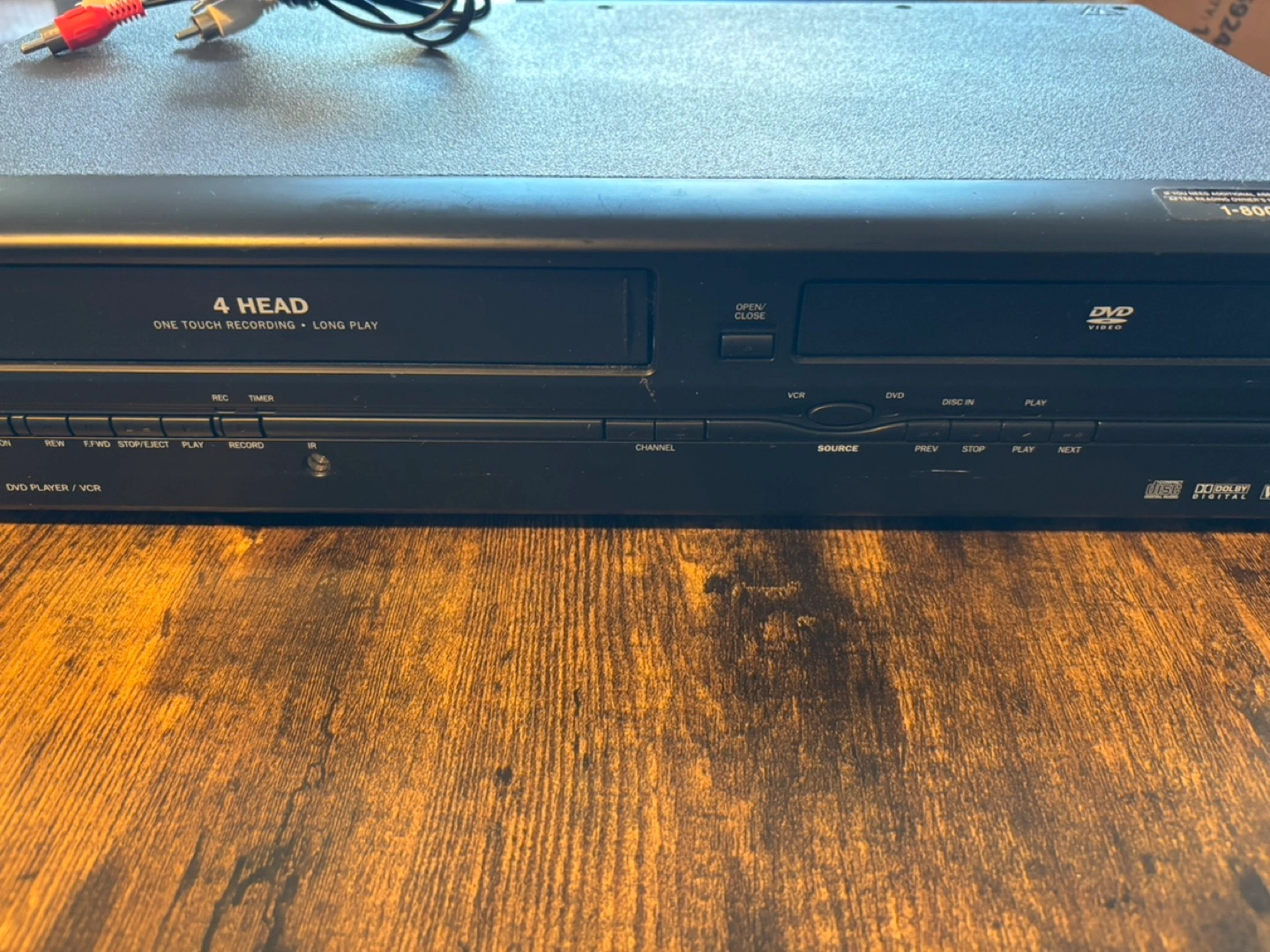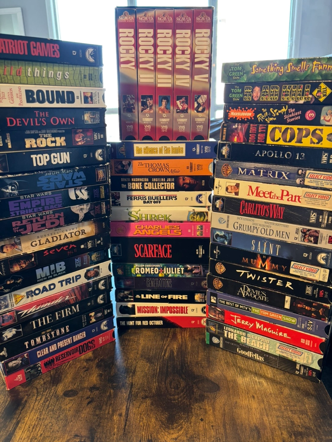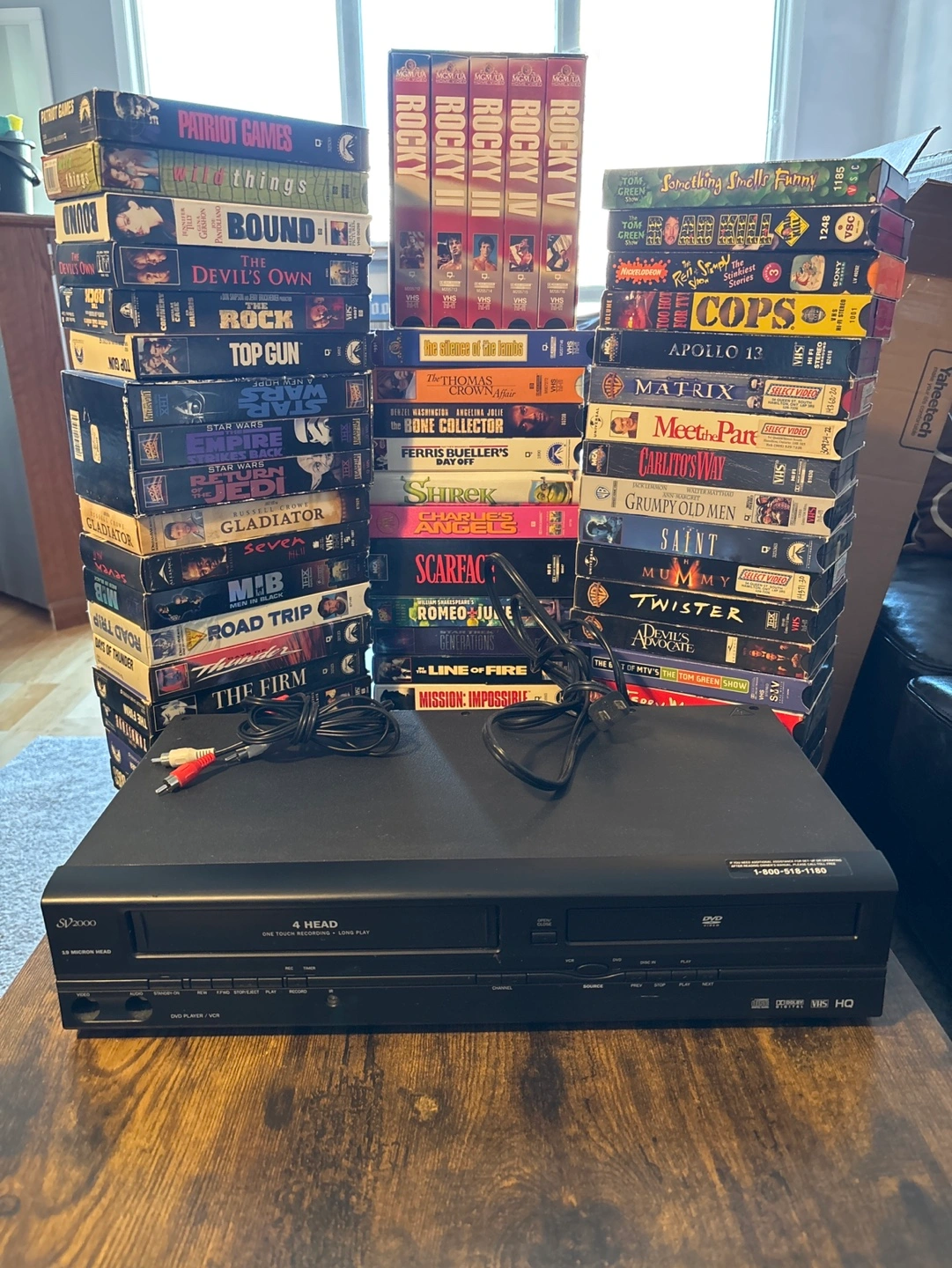 Sanyo VHS VCR/DVD combo player. Plays VHS tapes and DVDs. Includes VHS library. Various titles included.