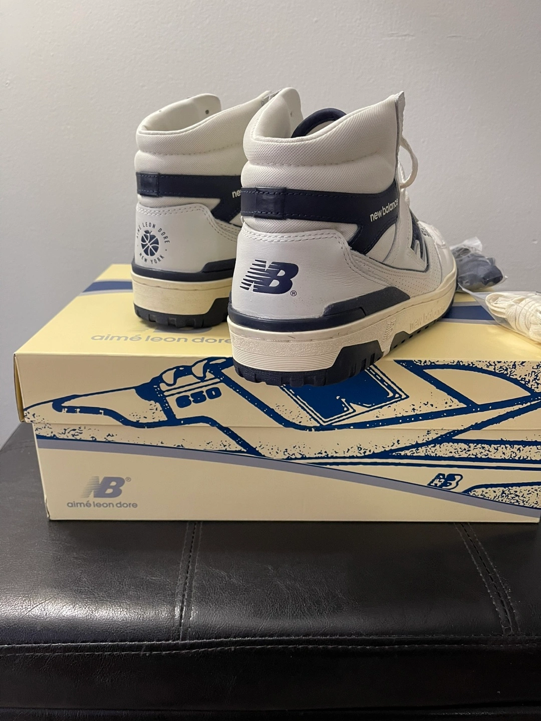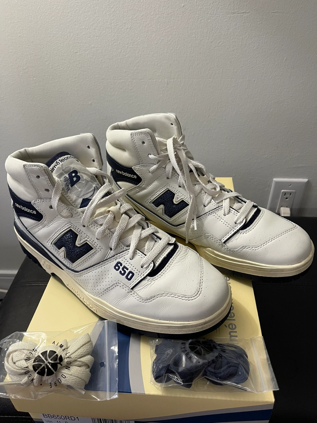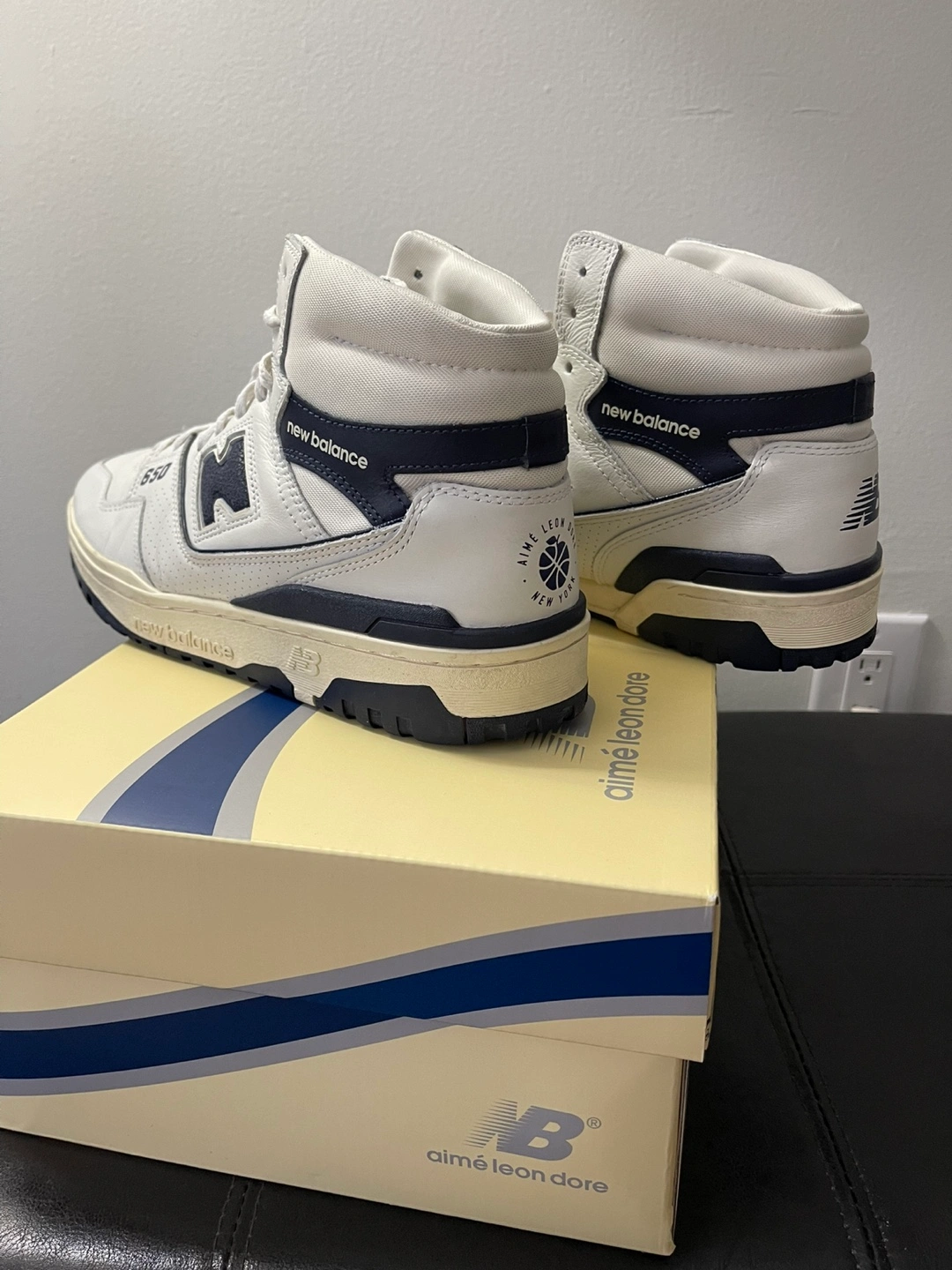 Men's New Balance 650 high-top sneakers. Collaboration with Aimé Leon Dore. Size 11 D US, 10 1/2 UK, 45 EUR. Off-white leather upper with navy accents. Comes with original box and extra laces.