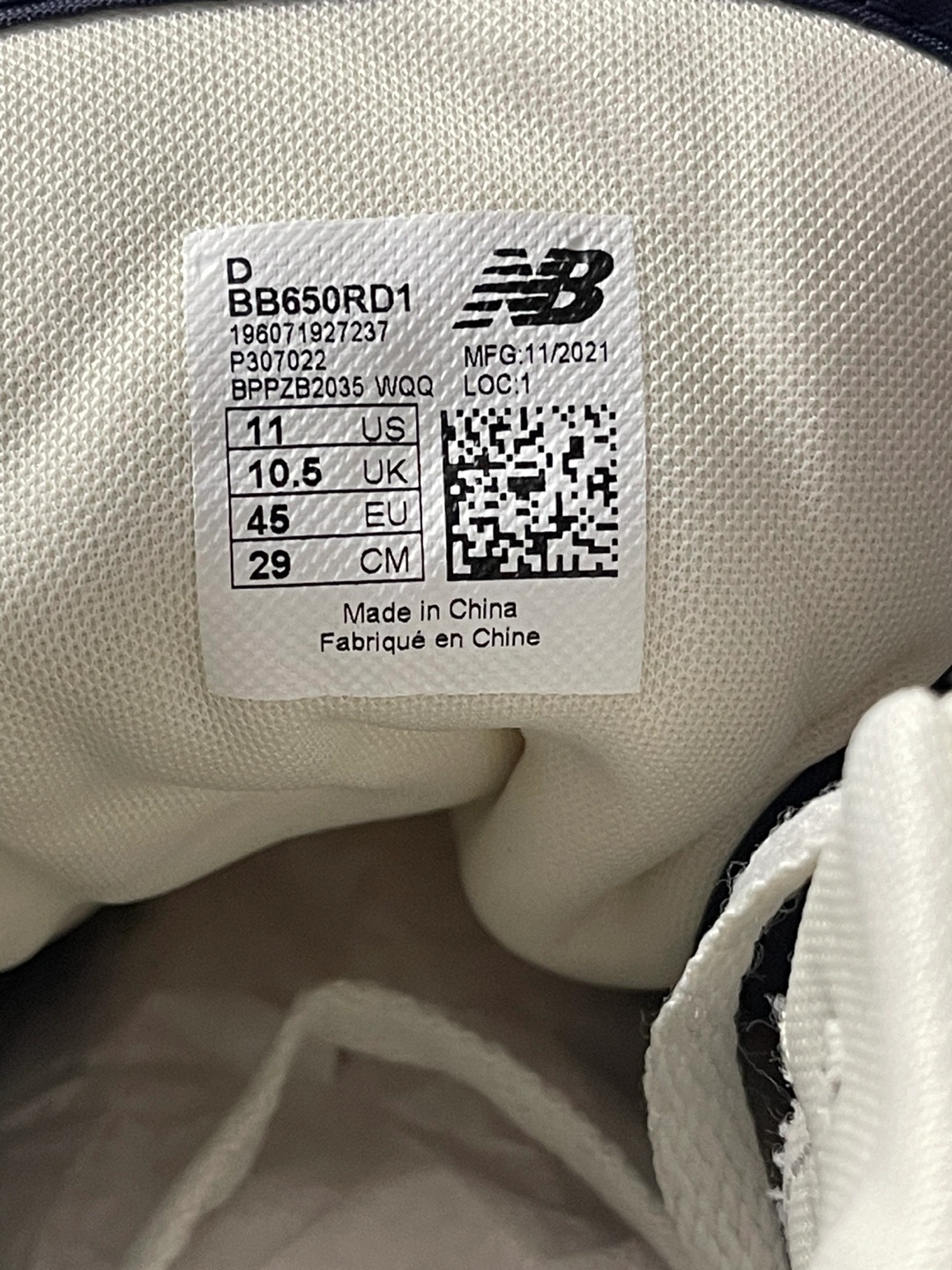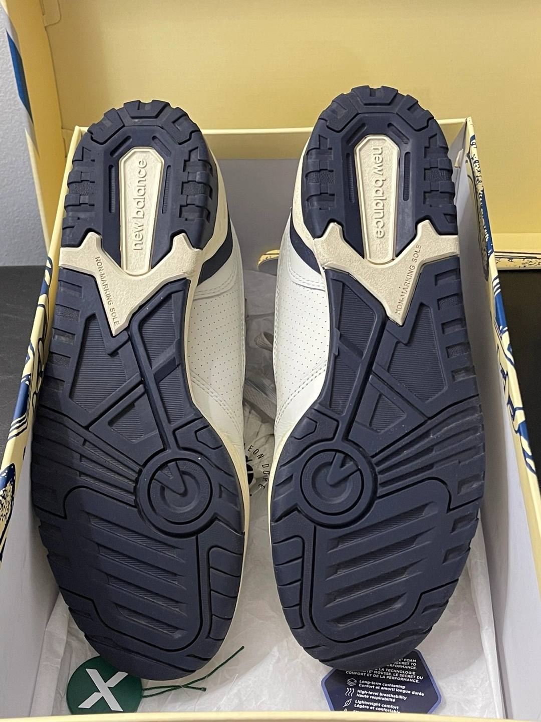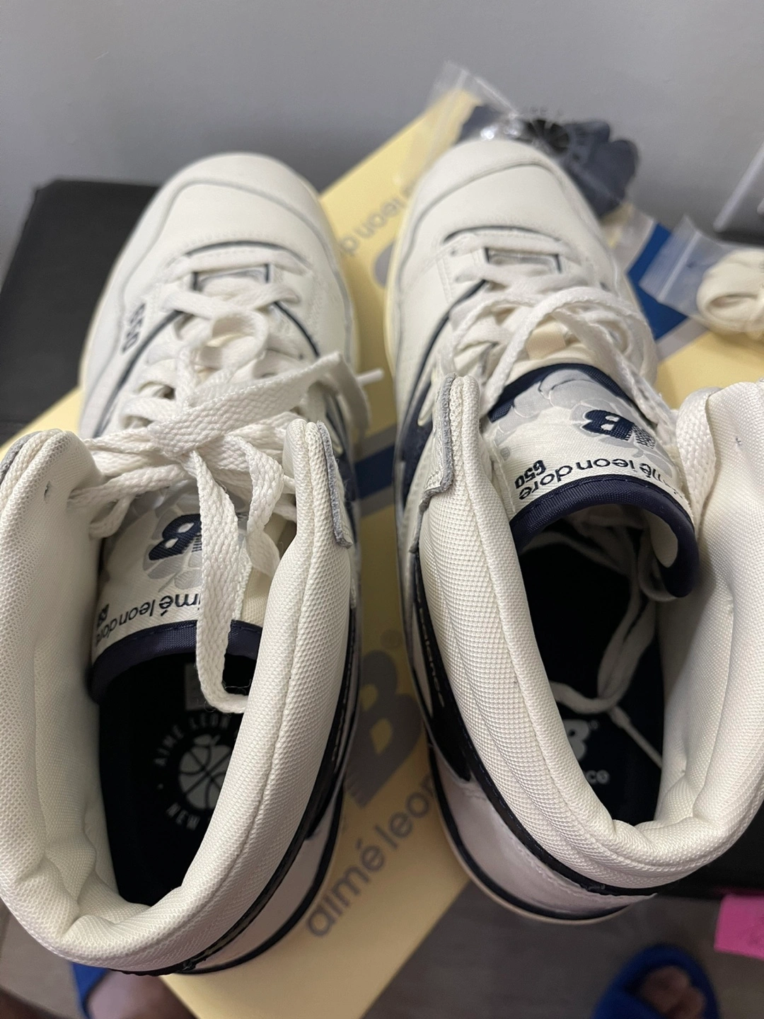 Men's New Balance 650 high-top sneakers. Collaboration with Aimé Leon Dore. Size 11 D US, 10 1/2 UK, 45 EUR. Off-white leather upper with navy accents. Comes with original box and extra laces.
