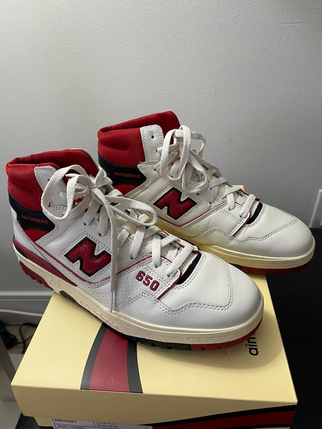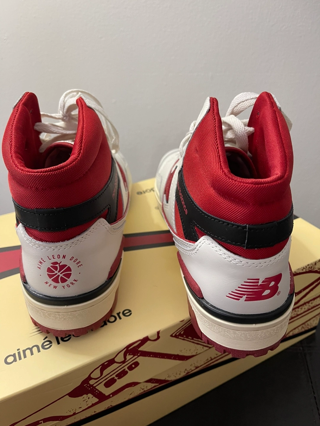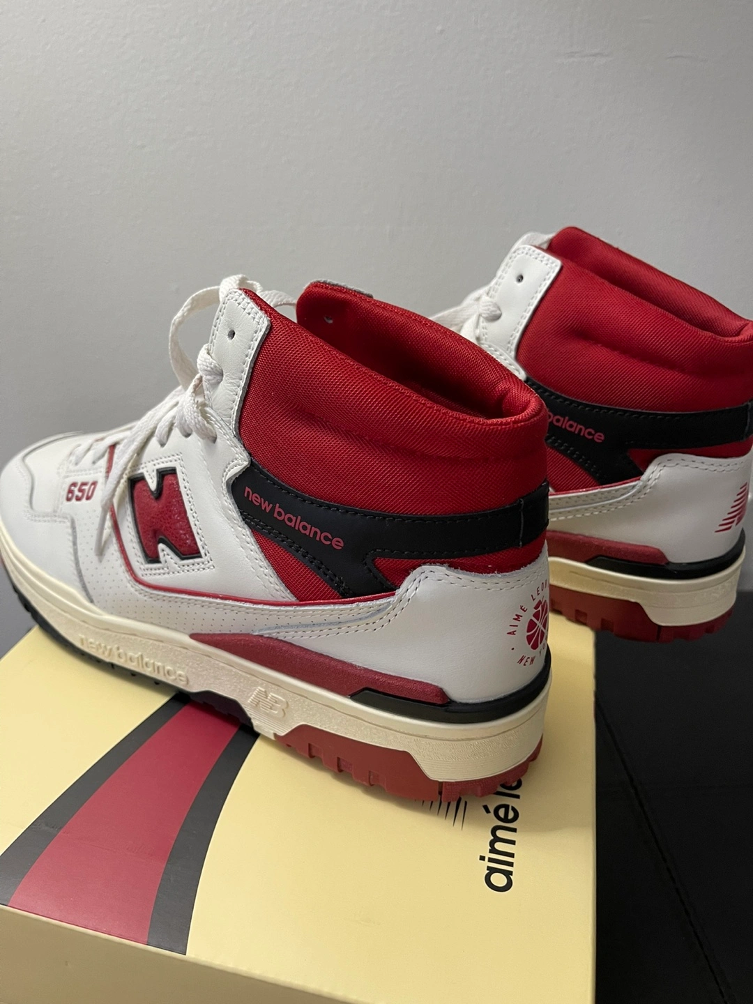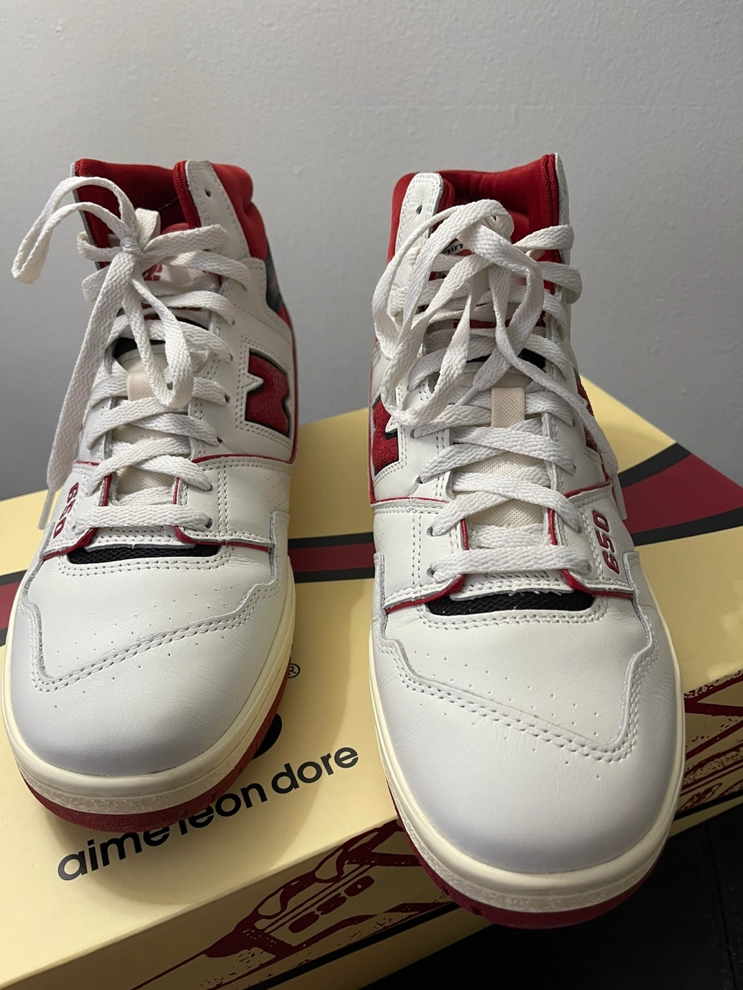 Men's high-top sneakers. White leather upper, red accents. Aimé Leon Dore branding. New Balance 650 model. Size 11.