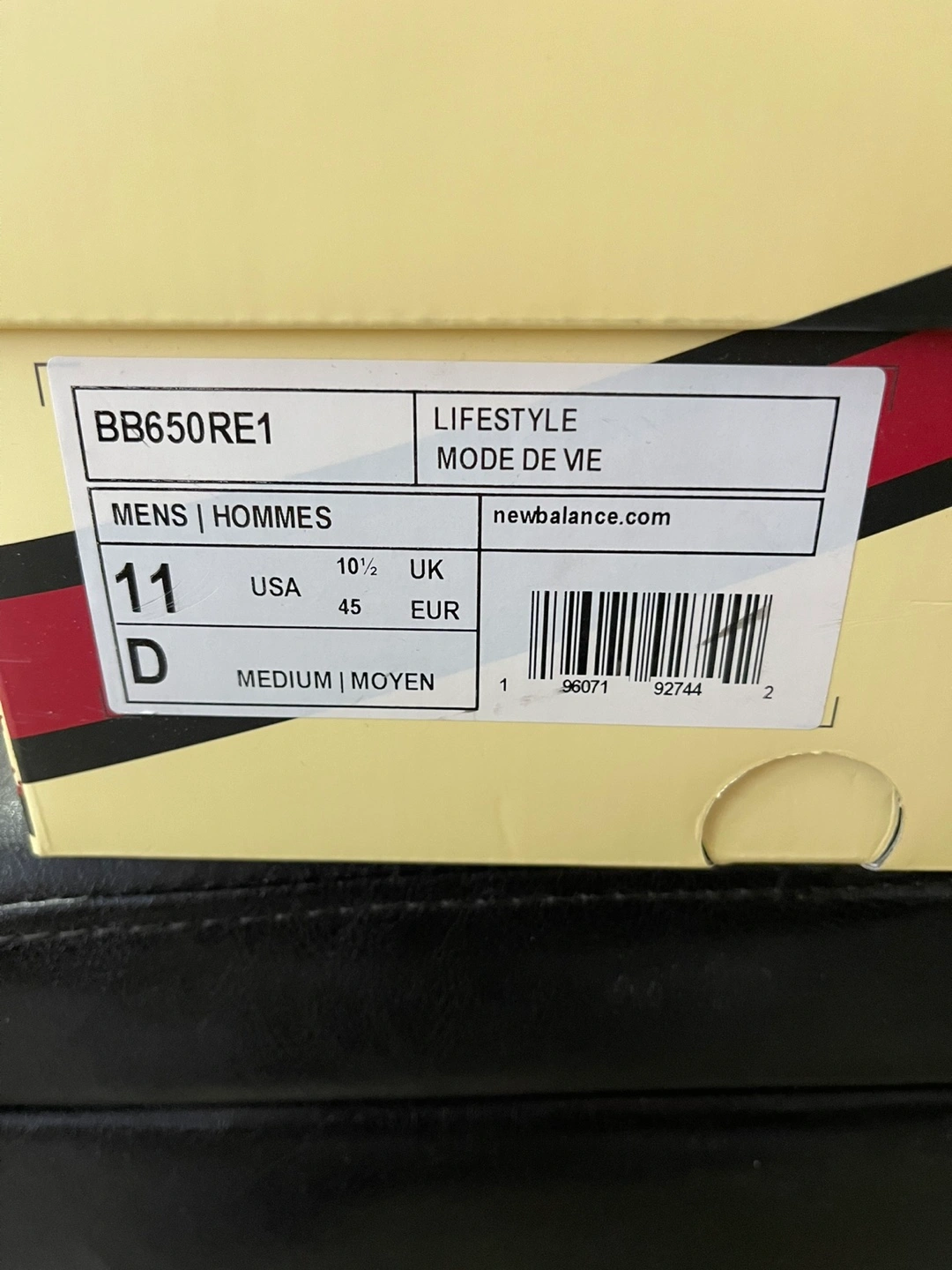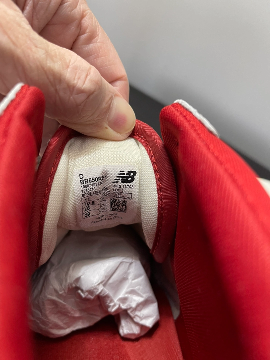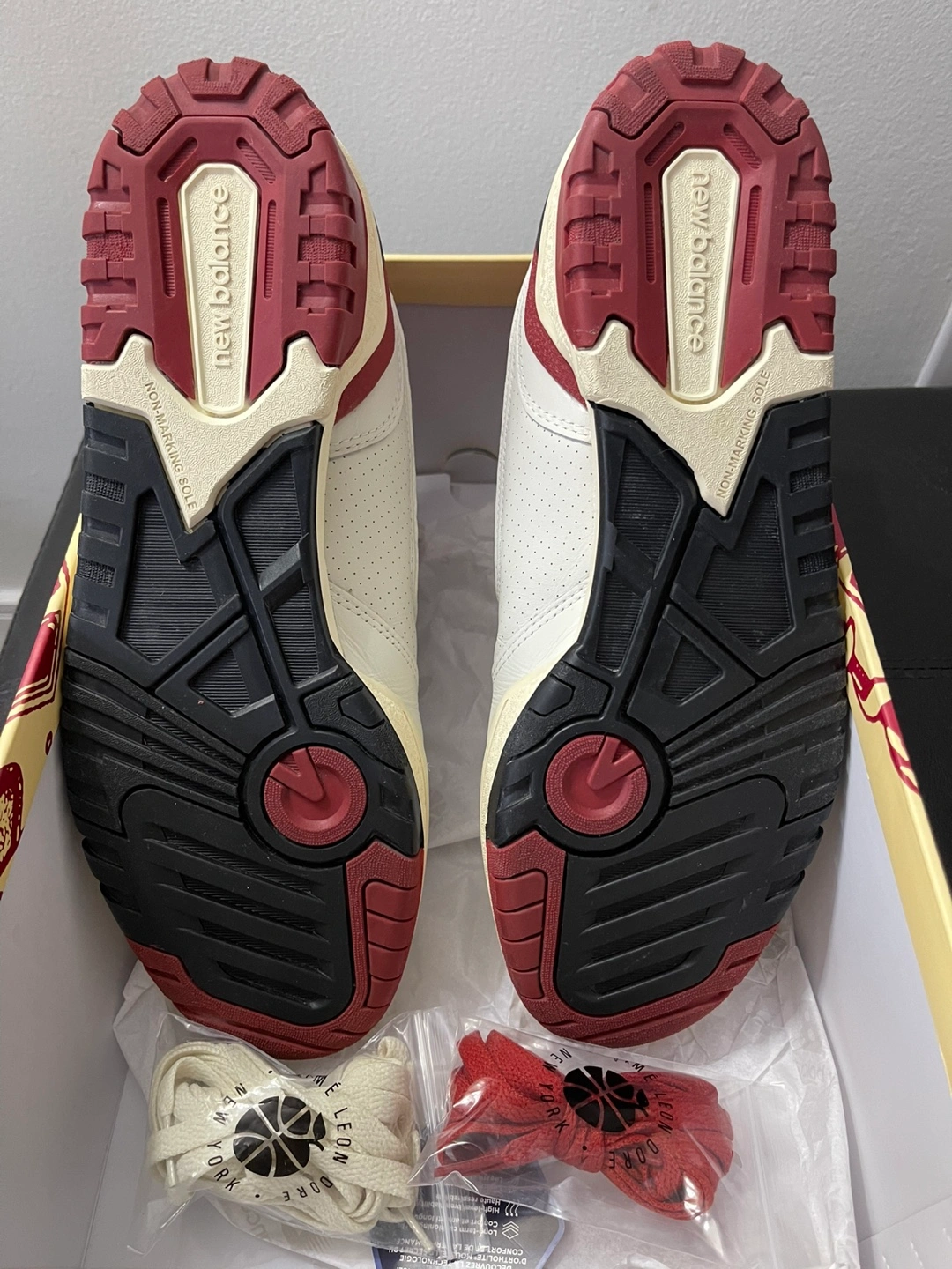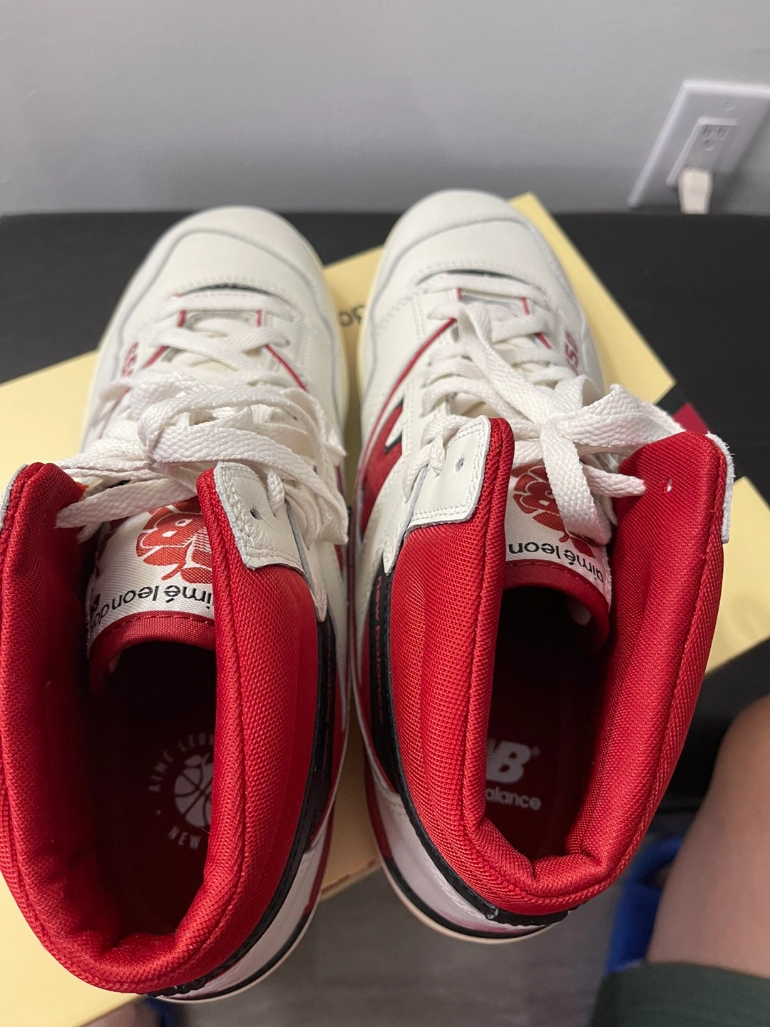 Men's high-top sneakers. White leather upper, red accents. Aimé Leon Dore branding. New Balance 650 model. Size 11.