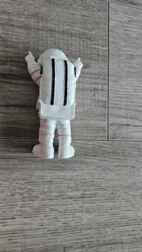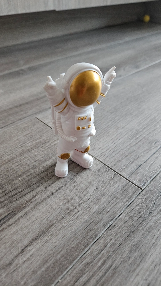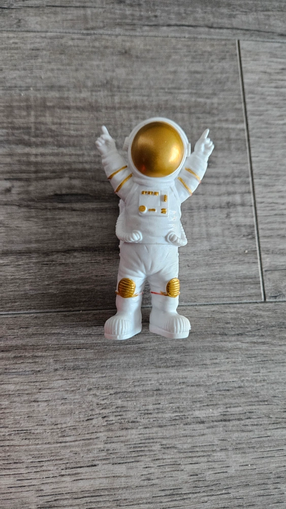 Cute astronaut figurine. Gold helmet and white suit. Arms raised. Small collectible item. Perfect for space enthusiasts.