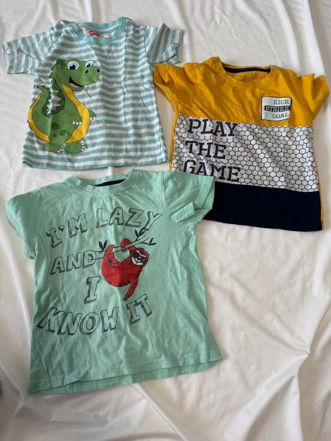 Five toddler boy's shirts, three short-sleeved t-shirts with various designs and colours, one grey marl short-sleeved t-shirt, and one lime green and navy plaid cardigan. Size:2-3years