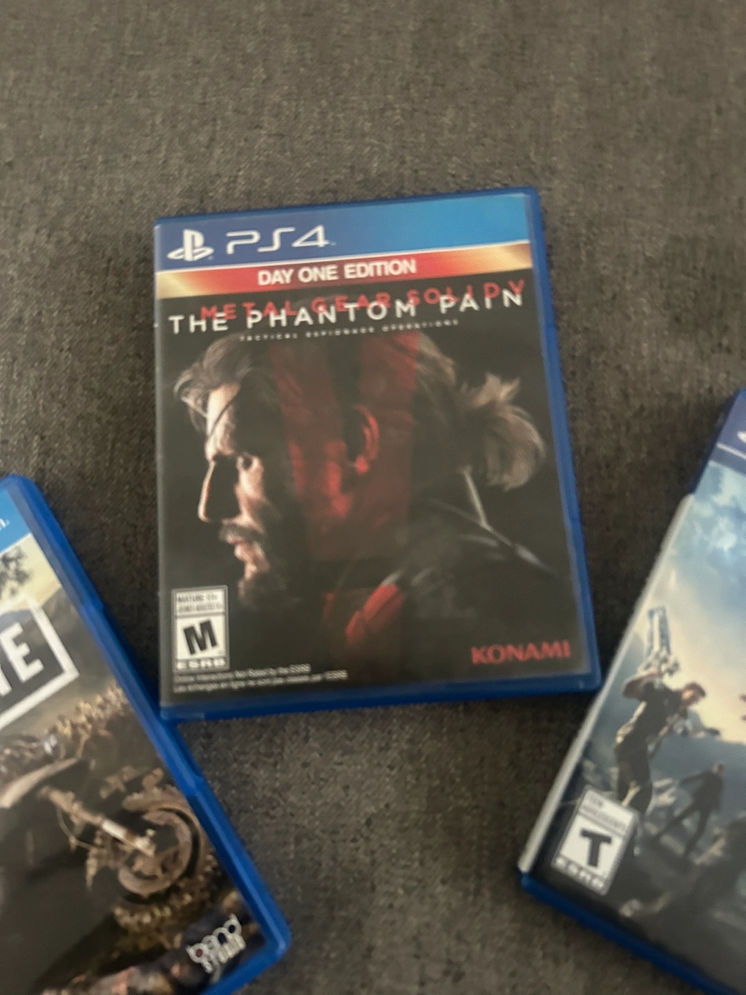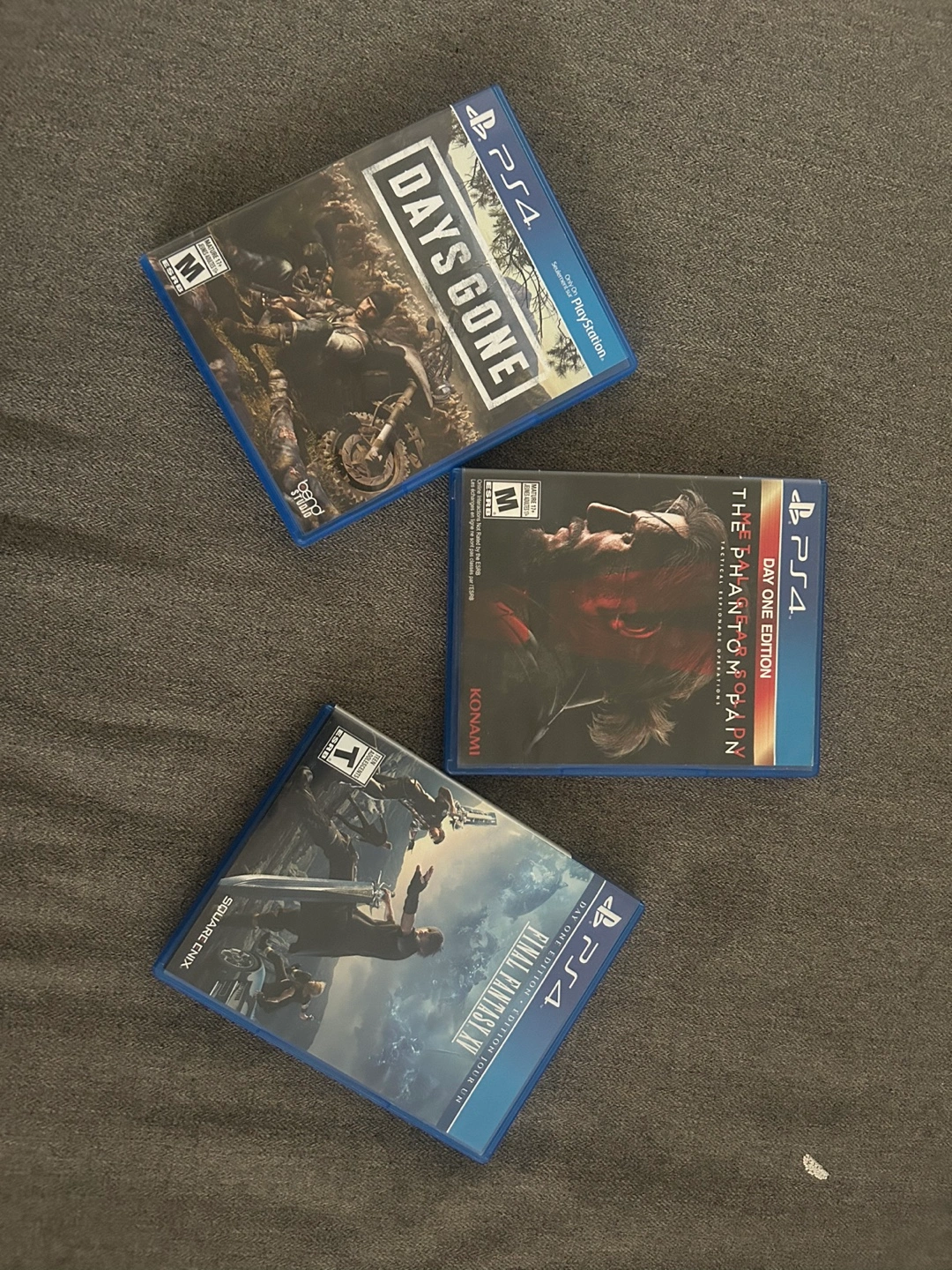Three PlayStation 4 games: Days Gone, Final Fantasy XV (Day One Edition), and Metal Gear Solid V: The Phantom Pain (Day One Edition).