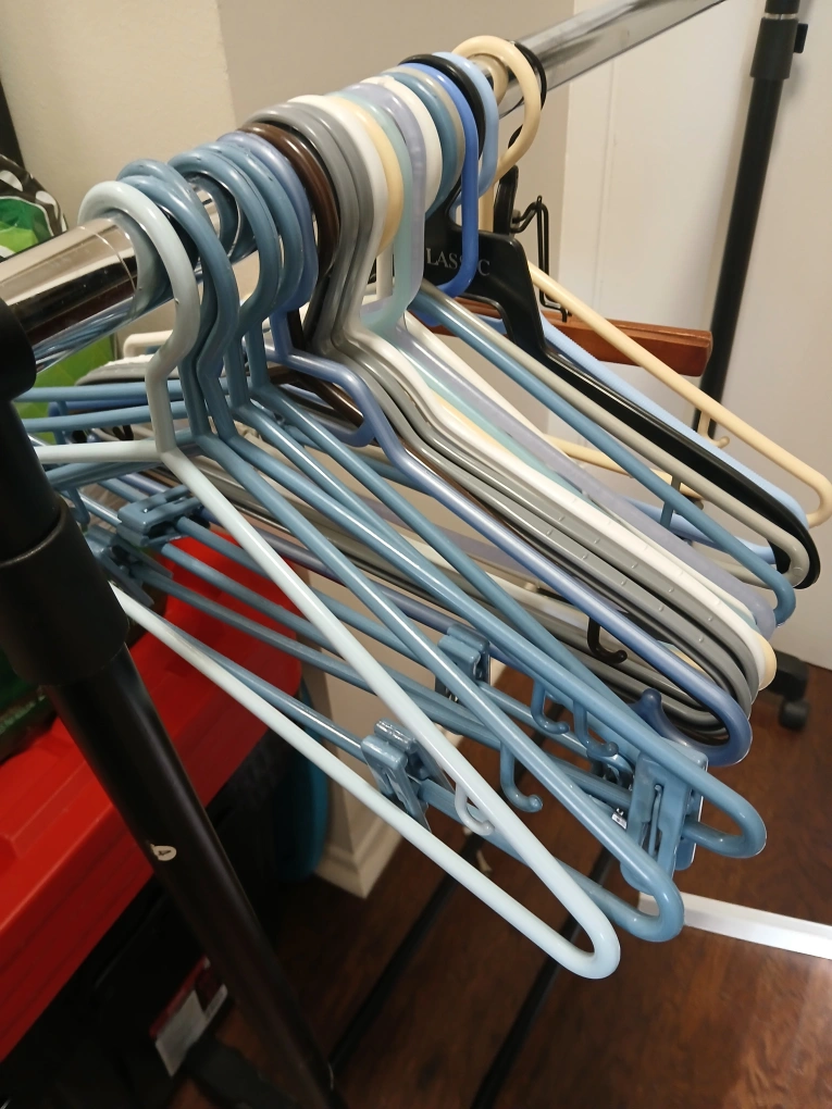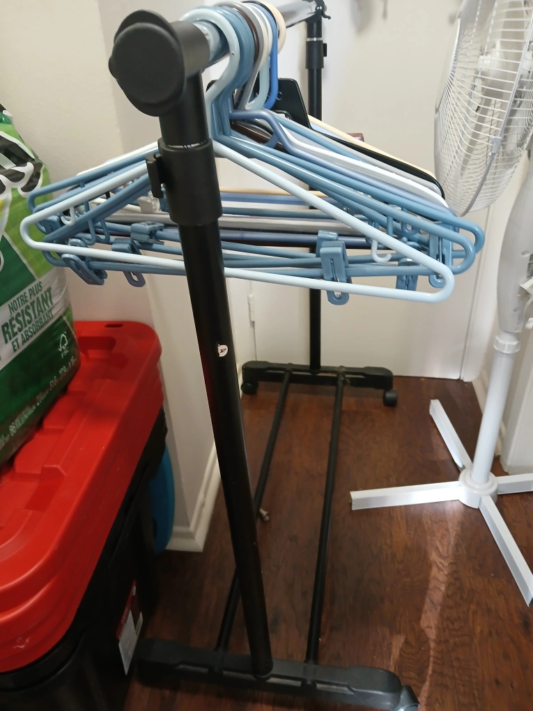 Black and chrome clothing rack. Can be raised to Max Height: Width 36" x Depth 17" Height 5' 6", Minimum Height when lowered is 38". Photos depict the bar lowered to 38". Includes multiple plastic hangers. Various colours. Great for organizing and drying clothes. Pick up only.