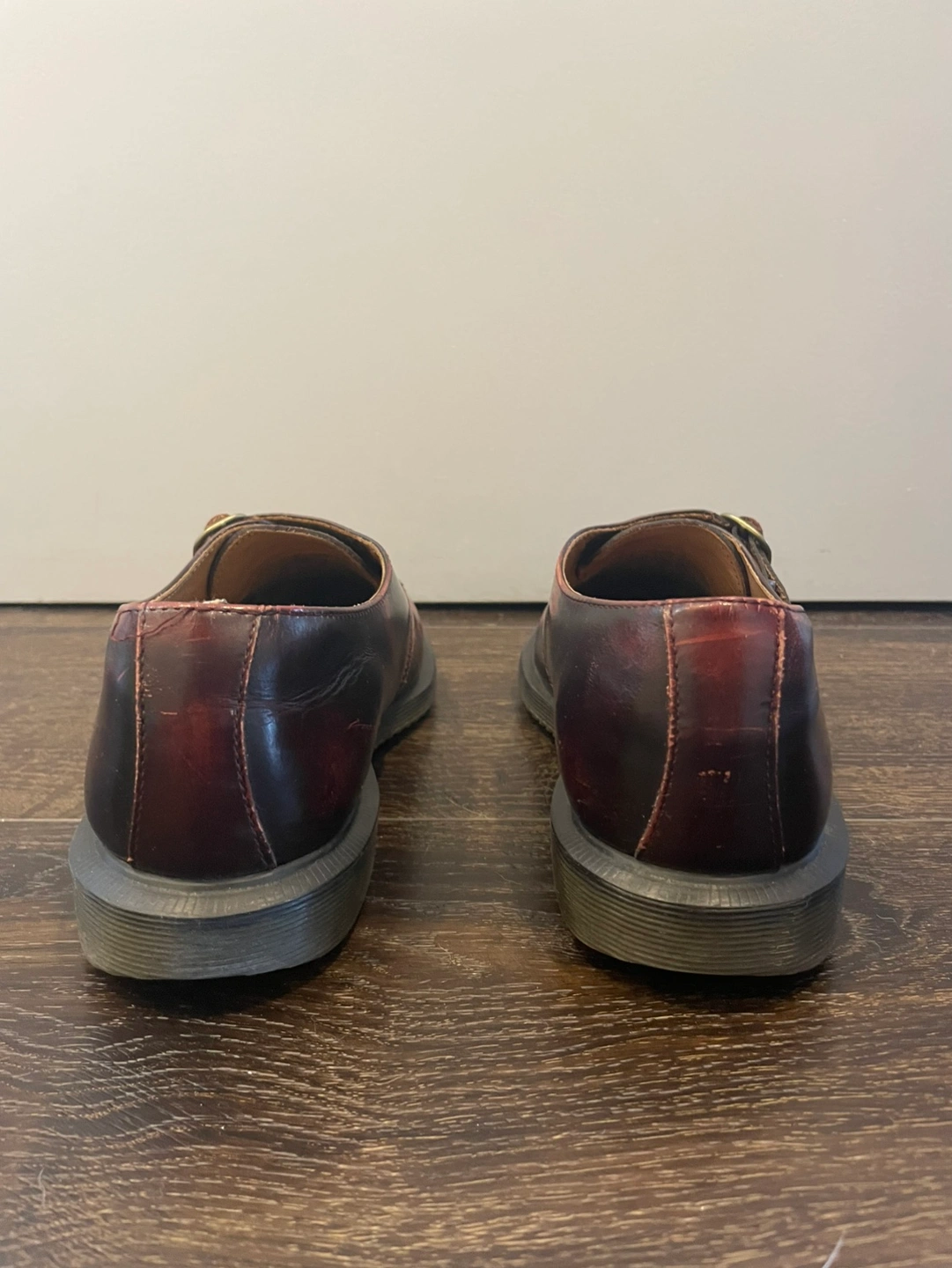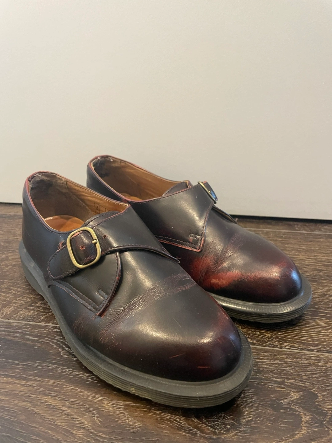 Dr. Martens Shoes in high shine cherry red leather with a metal buckled closure and chunky outsole
