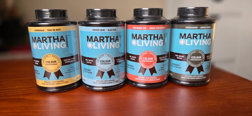 Four Martha Stewart Living paint samples. Pre-tinted testers. Colours include Cornbread, Aegean Blue, Persimmon Red, and Crevecoeur. Interior latex eggshell finish. Low odour, low VOC.
